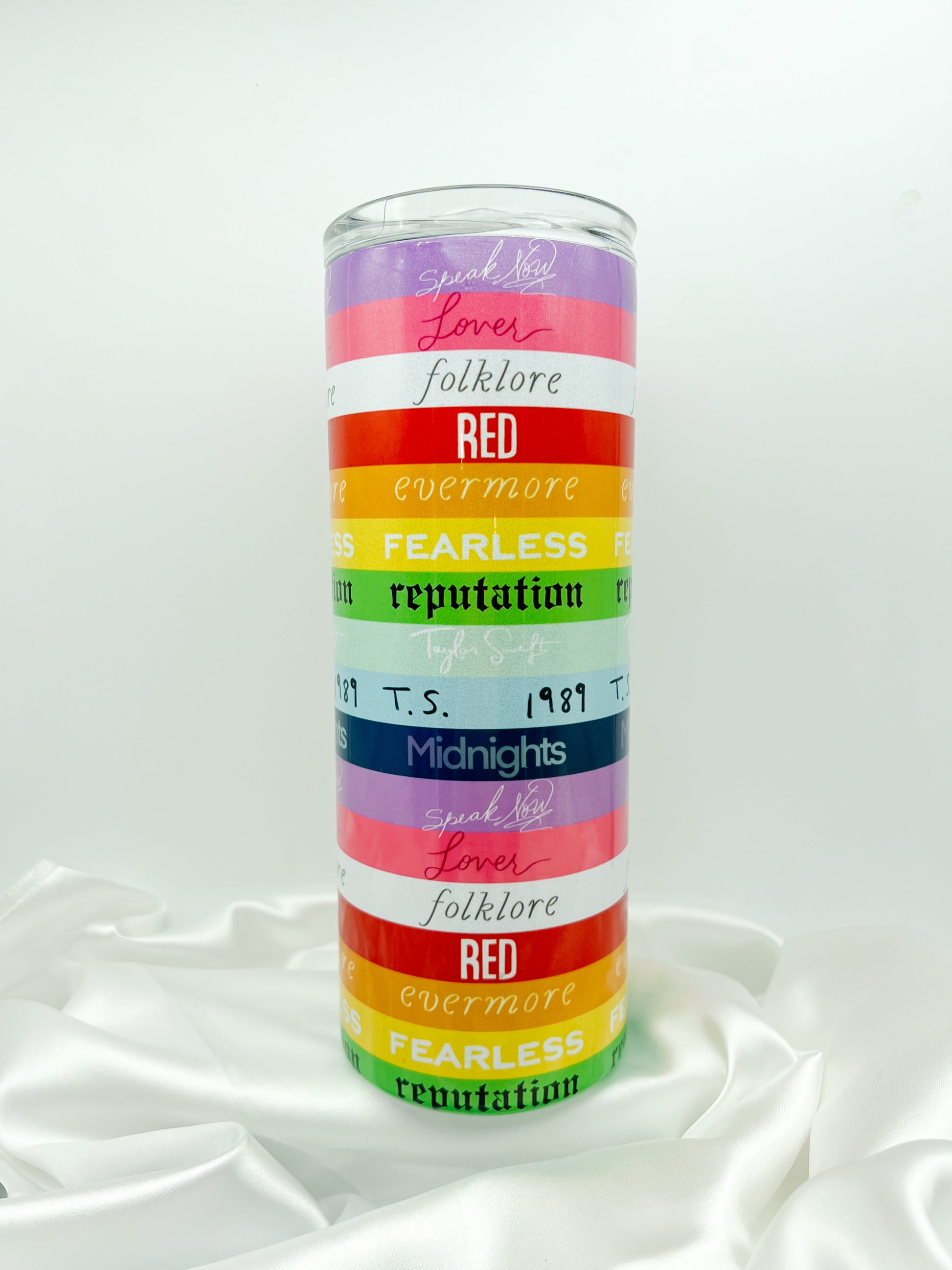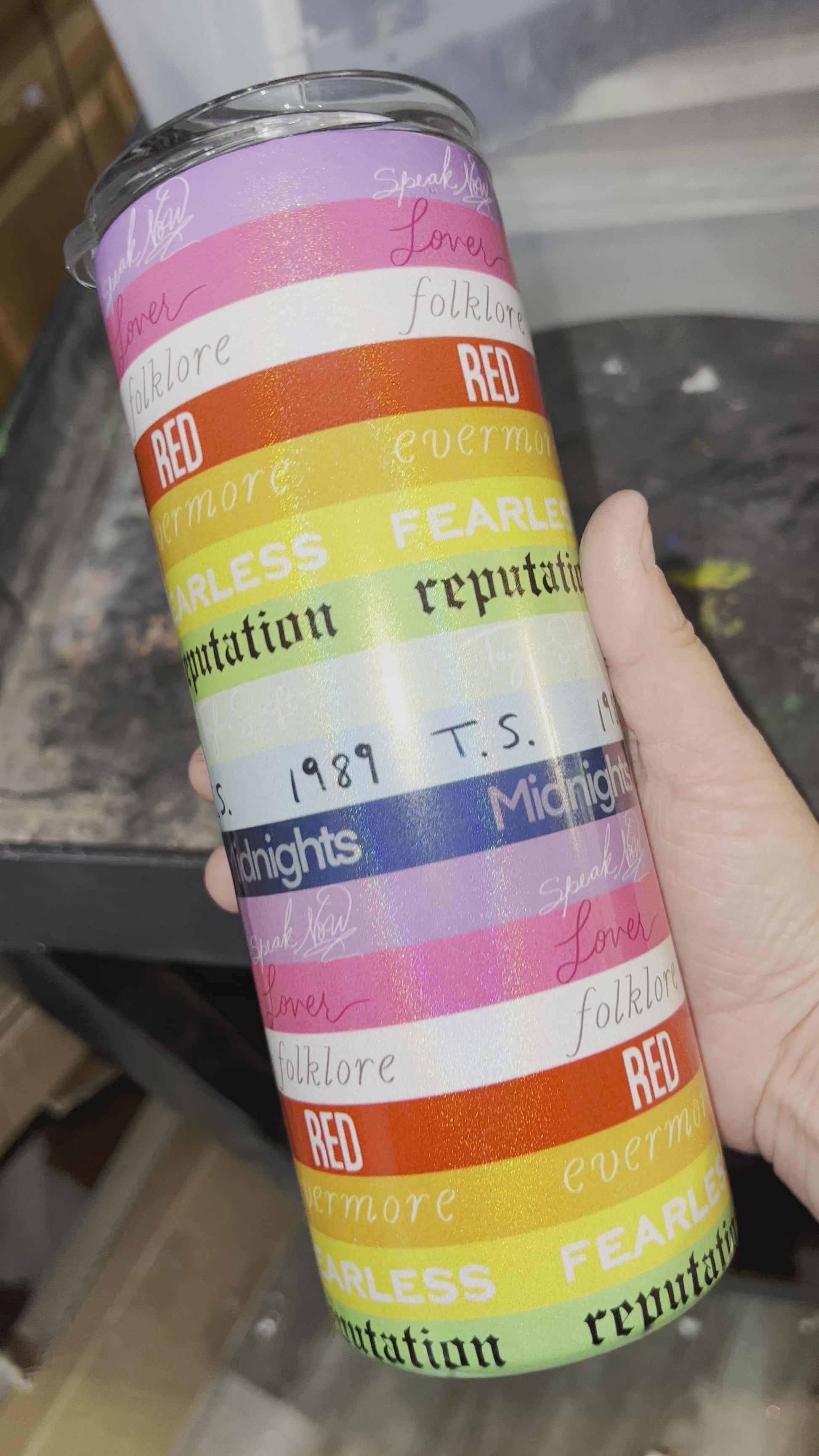25oz Taylor Swift Holographic Shimmer Tumbler featuring all her album titles! Sublimated on a holographic shimmer tumbler
