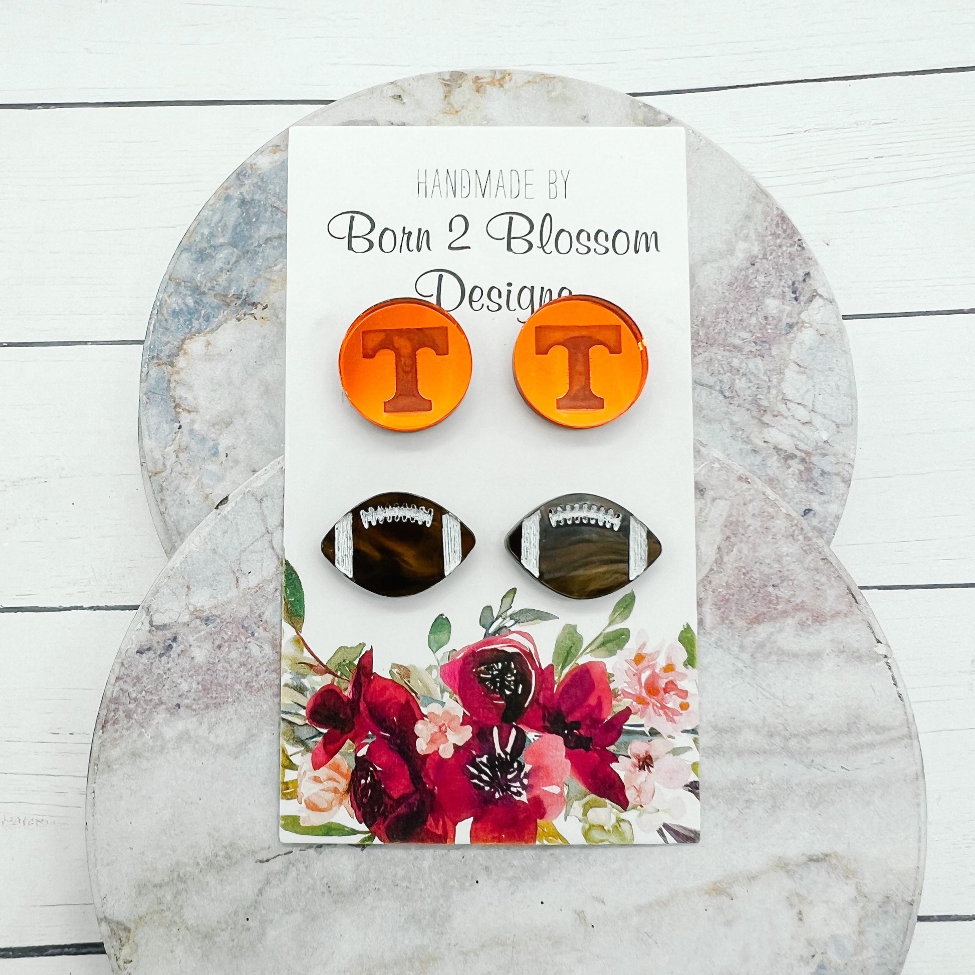 This listing is for TWO pairs of stud earrings. Tennessee Volunteers logo cut and engraved from orange mirror acrylic (super reflective and fun!). Football studs cut from a marbled brown acrylic. Perfect for University of Tennessee sports fans!!These ultra lightweight earrings measure .65 inches in diameter and have a push back.