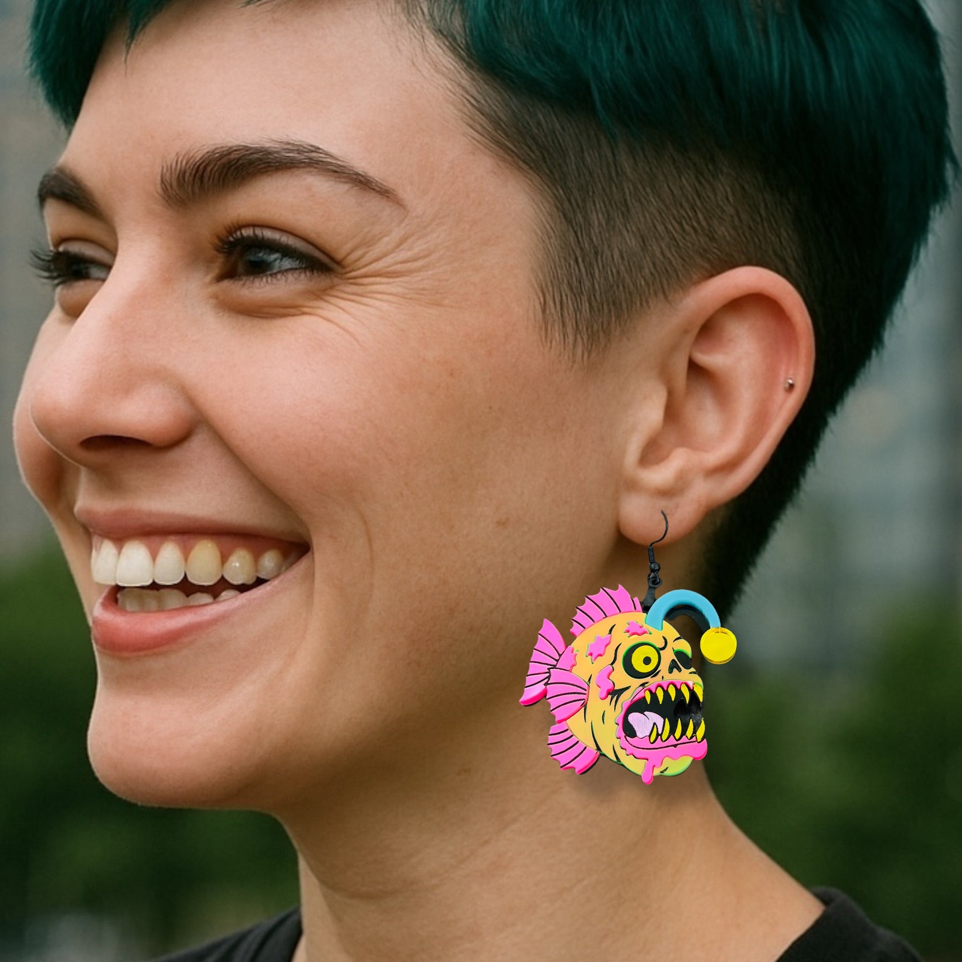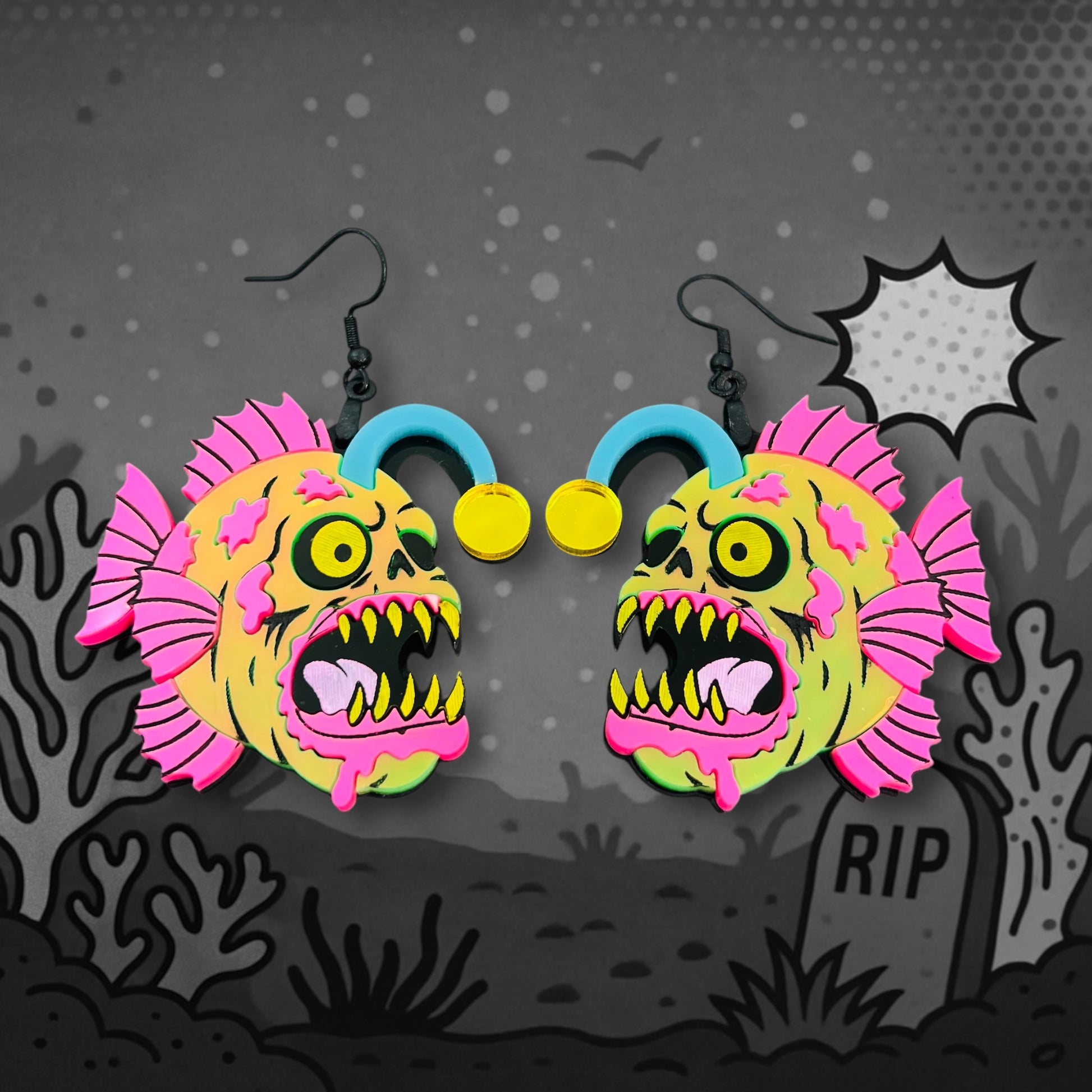 Incredible pop art zombie anglerfish cut from various neon acrylics! The green acrylic for the body is a color shifting reflective acrylic! These are showstoppers for sure!