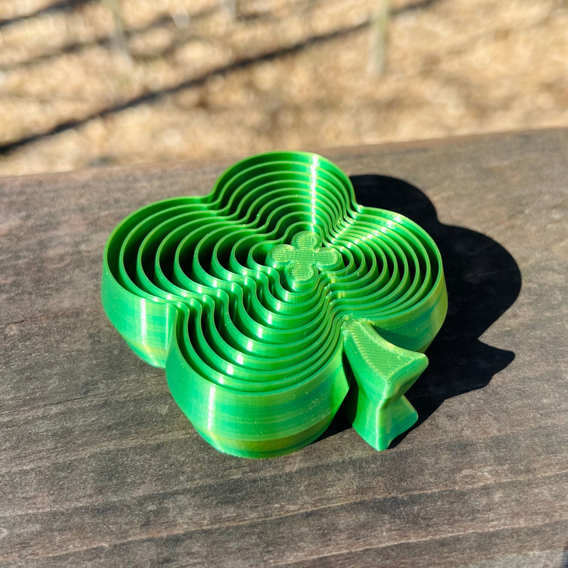 This is a 3d printed shamrock fidget made from a two tone yellow/green filament. It measures about 3x3 and 1.6” deep when collapsed.