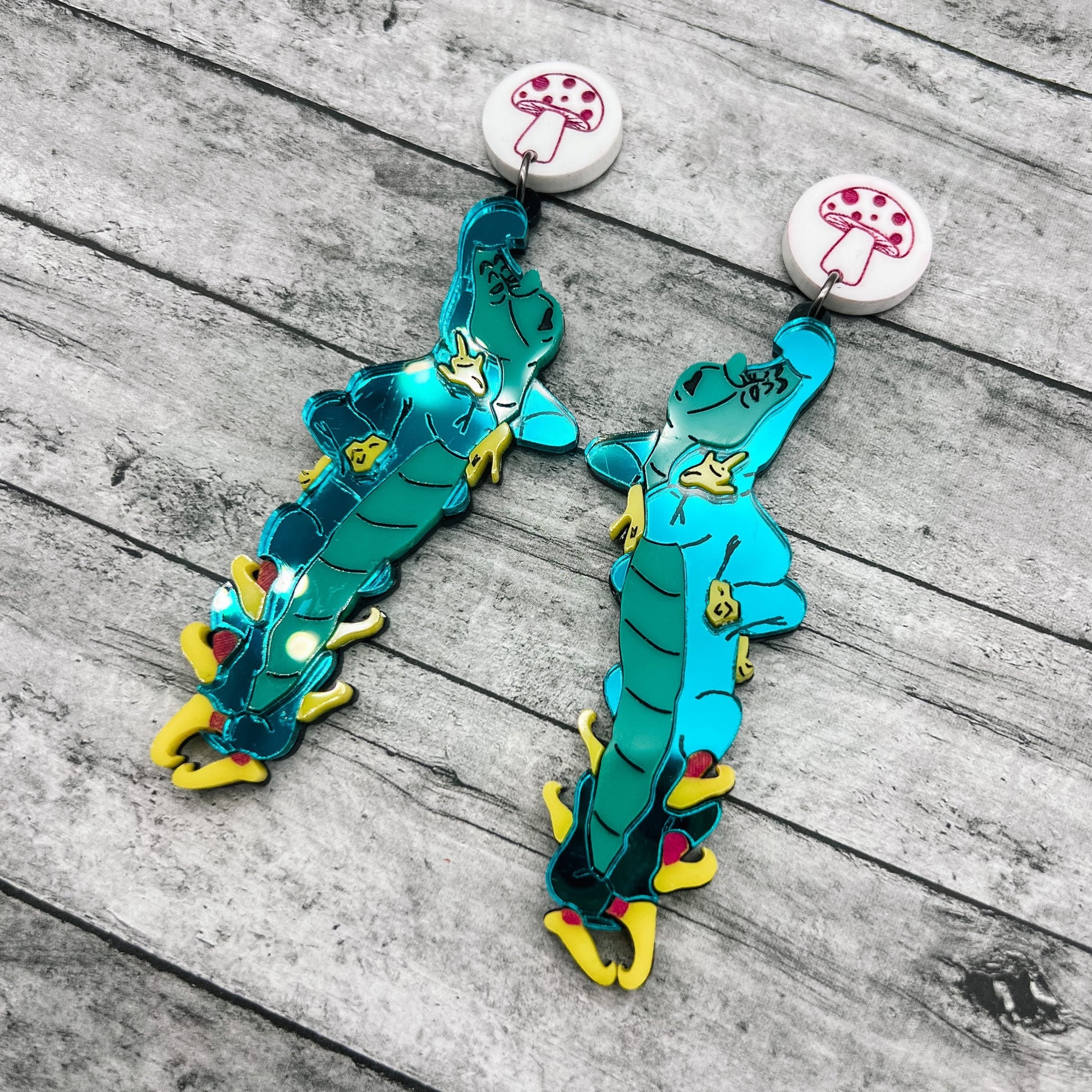 How incredible are these showstoppers?! Caterpillar from Alice in Wonderland cut from various acrylics, including super reflective teal mirror acrylic!These lightweight earrings measure 3” long not including the circle posts. (Hypoallergenic)