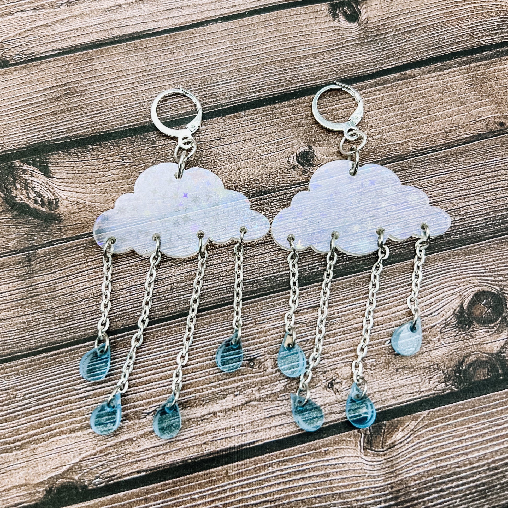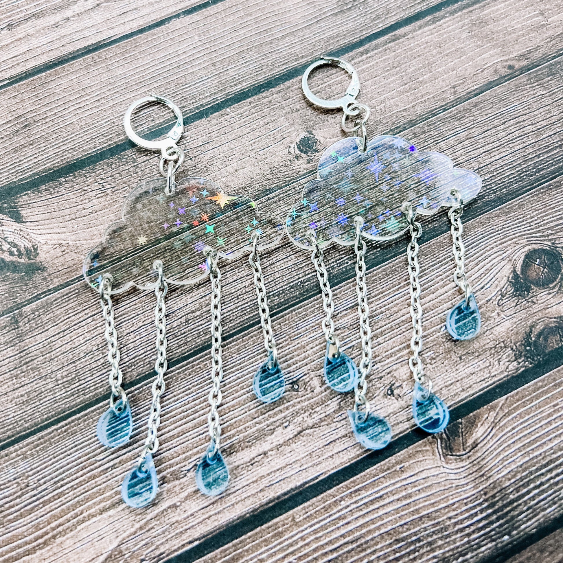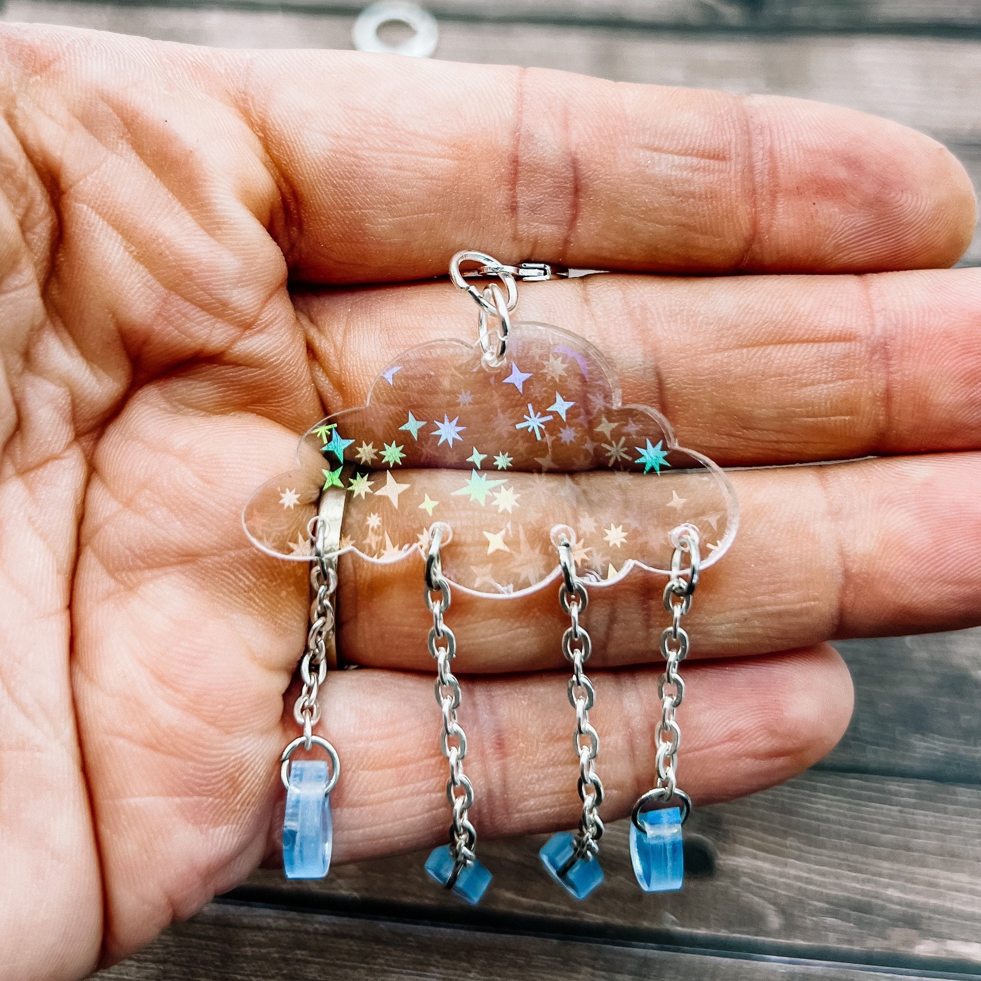 NOTE: Due to using translucent (see through) acrylic, we do not offer this design in a Brooch style.How incredible are these showstoppers?! 🤩 Laser cut clear clouds with holographic stars all over them! The rain drops are made from transparent fluorescent blue acrylic! Swipe through the pictures to check out the clouds!