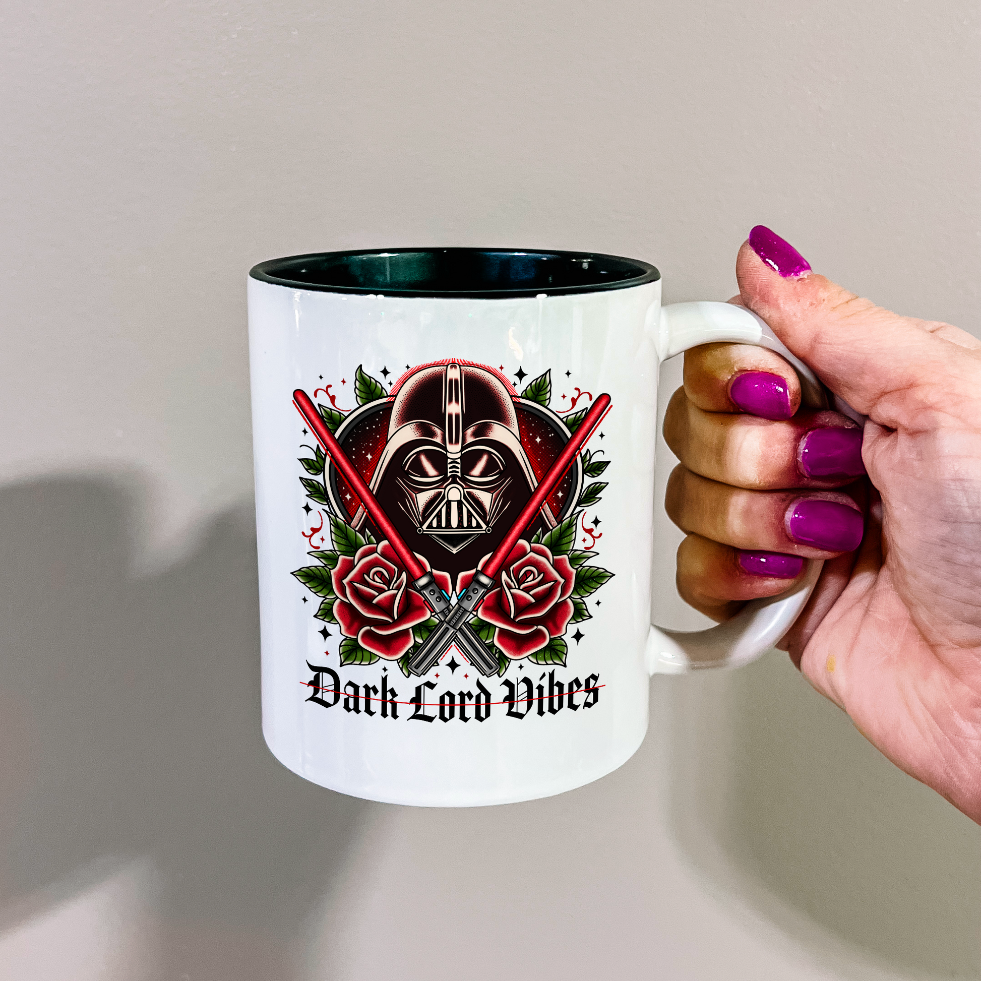 11oz Ceramic Mug with a black interior. This is a sublimated ceramic mug featuring Darth Vader in traditional tattoo style! Perfect for any Star Wars fan!