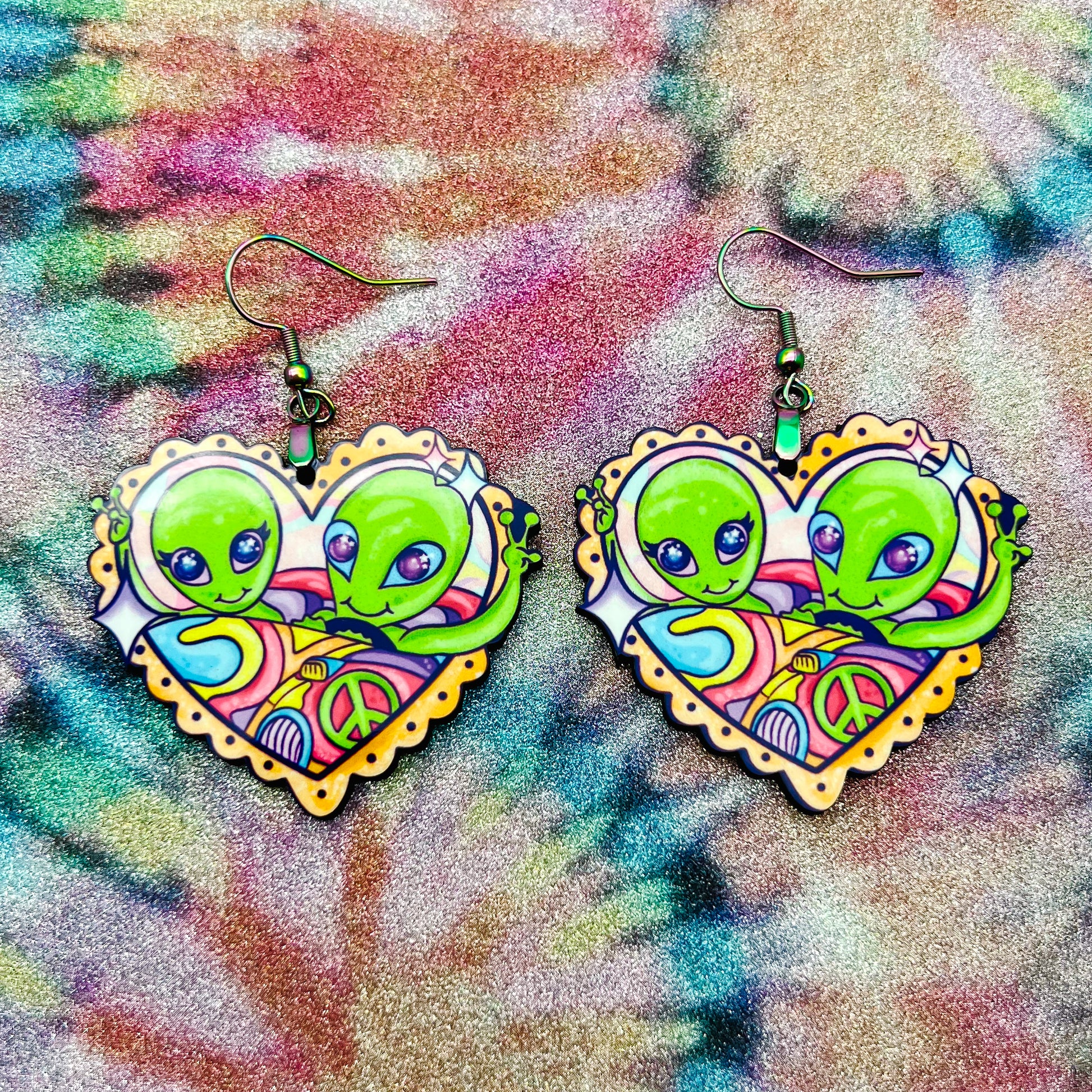 This listing is for one pair of Lisa Frank inspired alien dangle earrings. Sublimated on unisub (Backside is solid purple) making them very lightweight! Super glossy and fun! 90s fashion is coming back in style and these would make the perfect accessory!