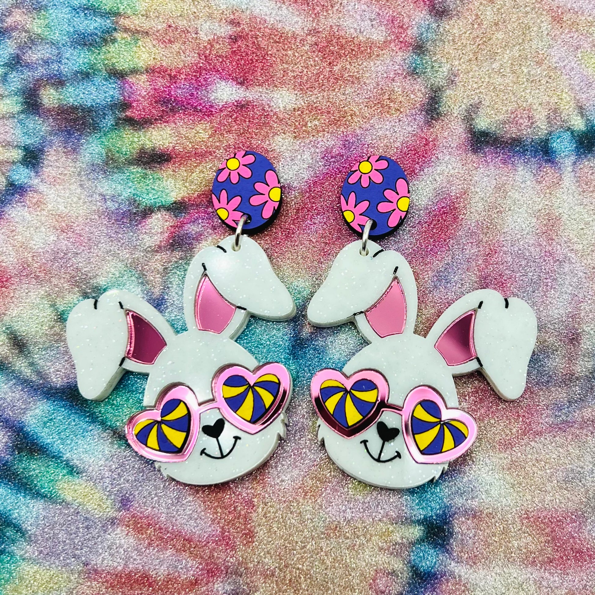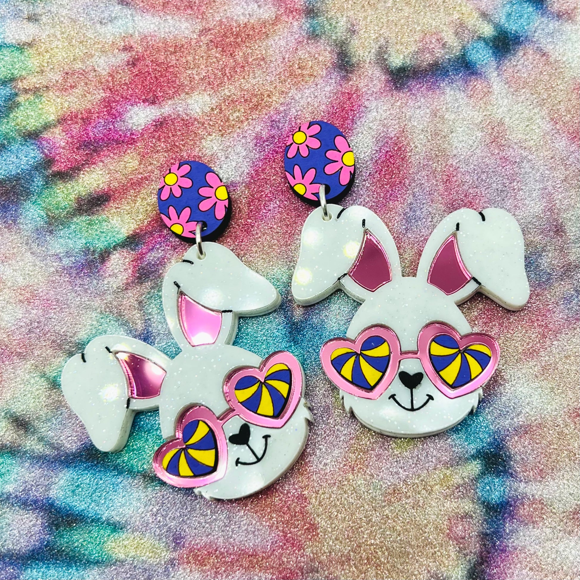 Laser cut acrylic Easter bunny cut from white glitter acrylic, pink mirror, and hand painted maple. These are so perfect for Easter!