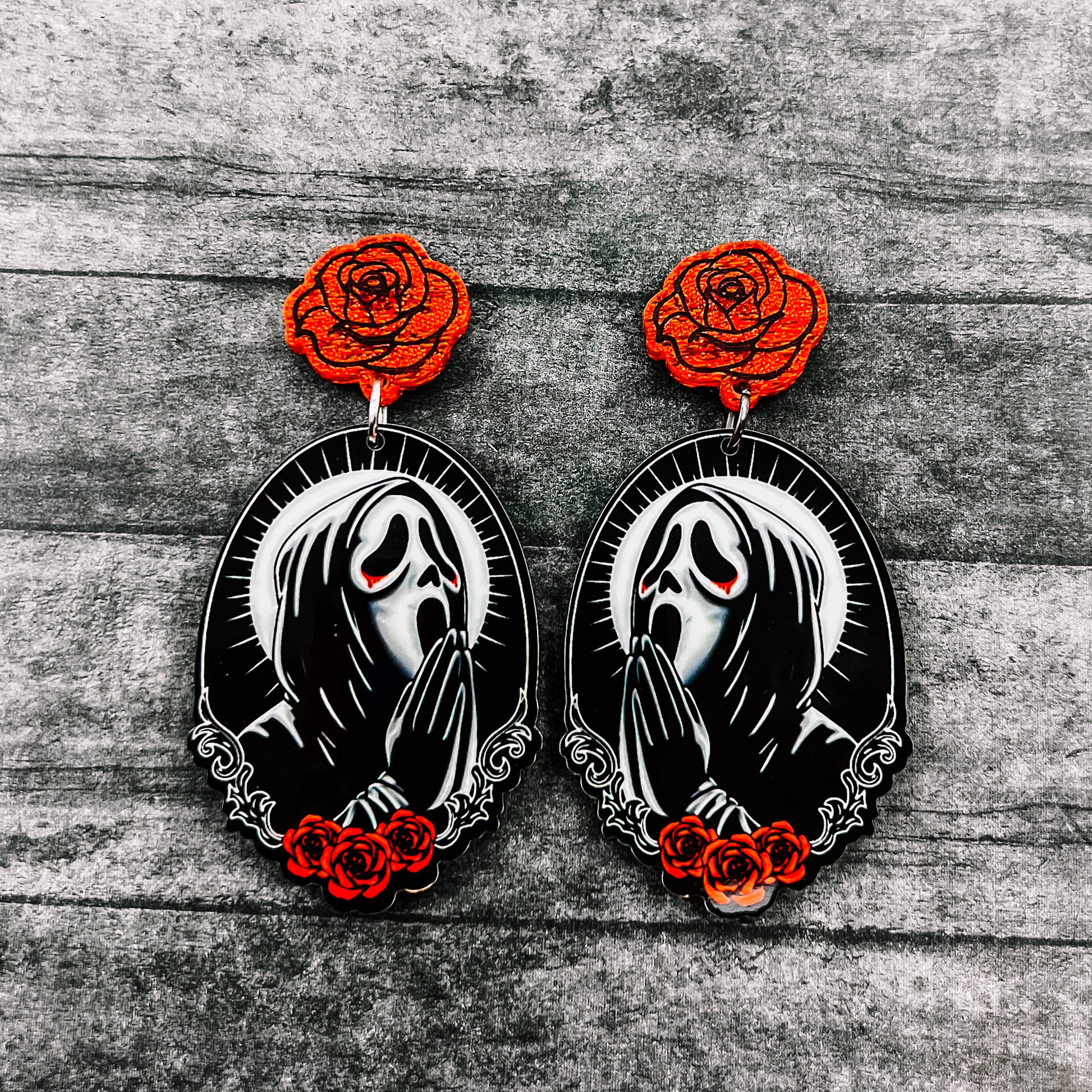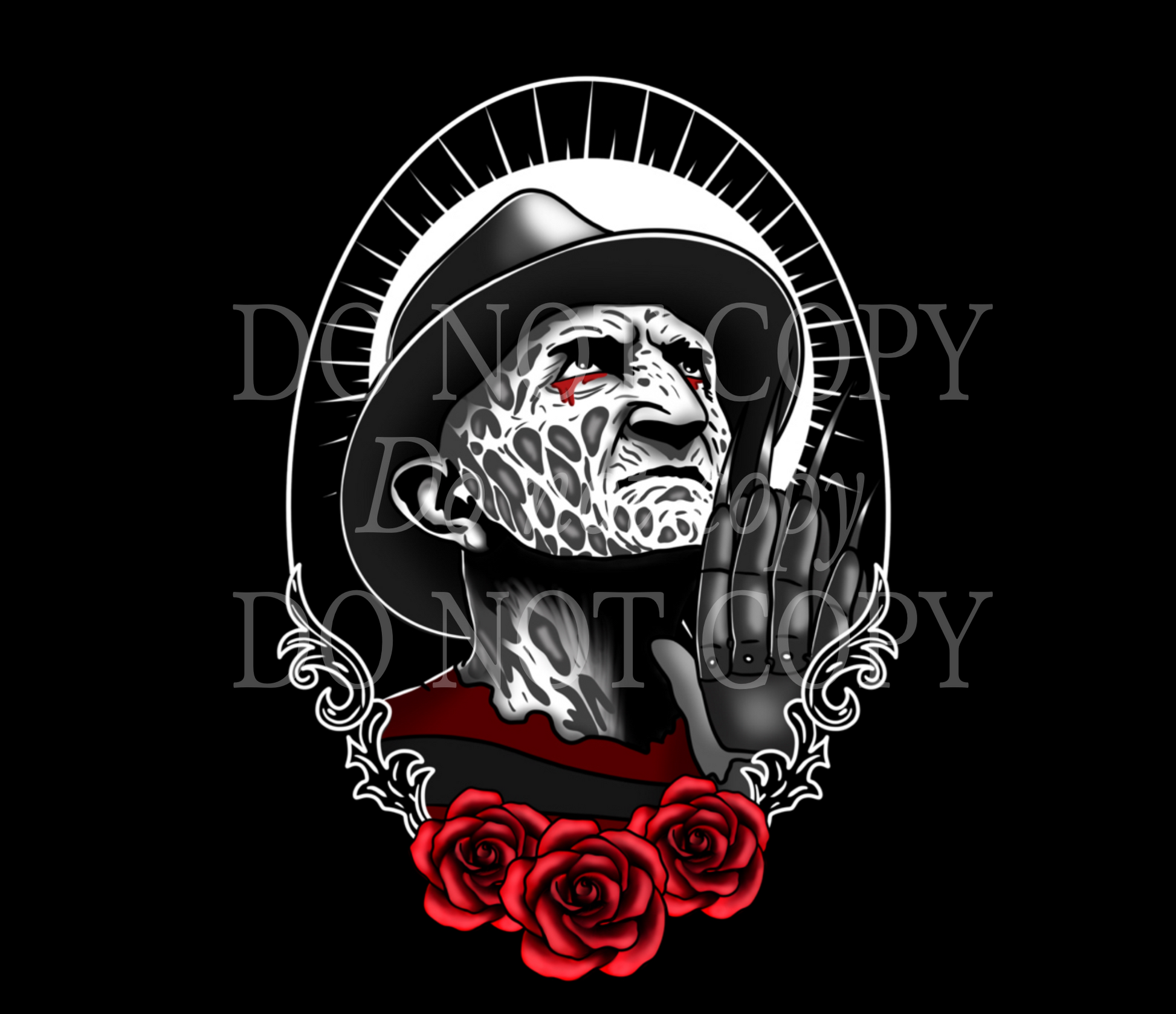 4 Of your horror characters in a prayer candle style! Your choice of Michael, Jason, Freddy, and Ghostface sublimated on single sided Unisub! Paired with a red glittery rose post
