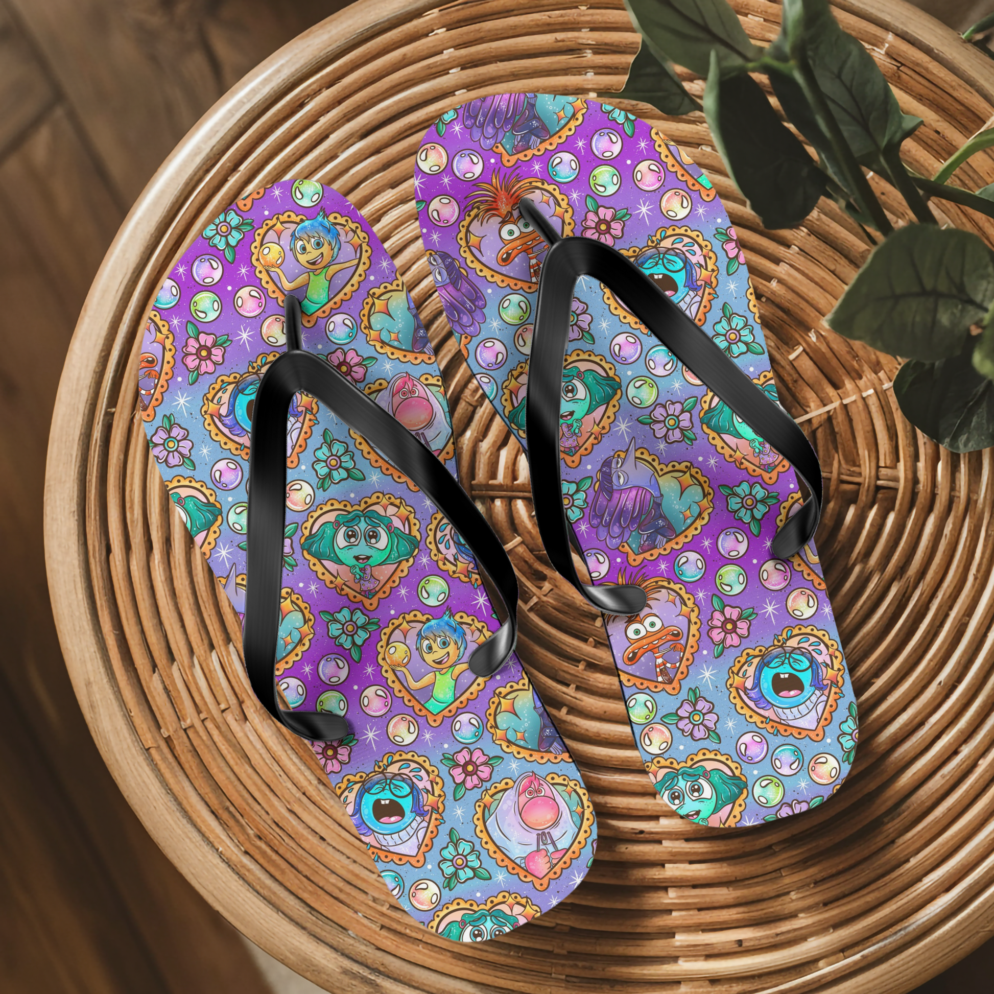 Sublimated unisex flip flops with a heart design of some of your favorite Inside Out characters!