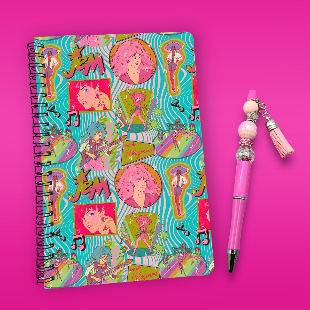 Iconic imagery from 80s cartoon, Jem, on a notebook with coordinating pen!