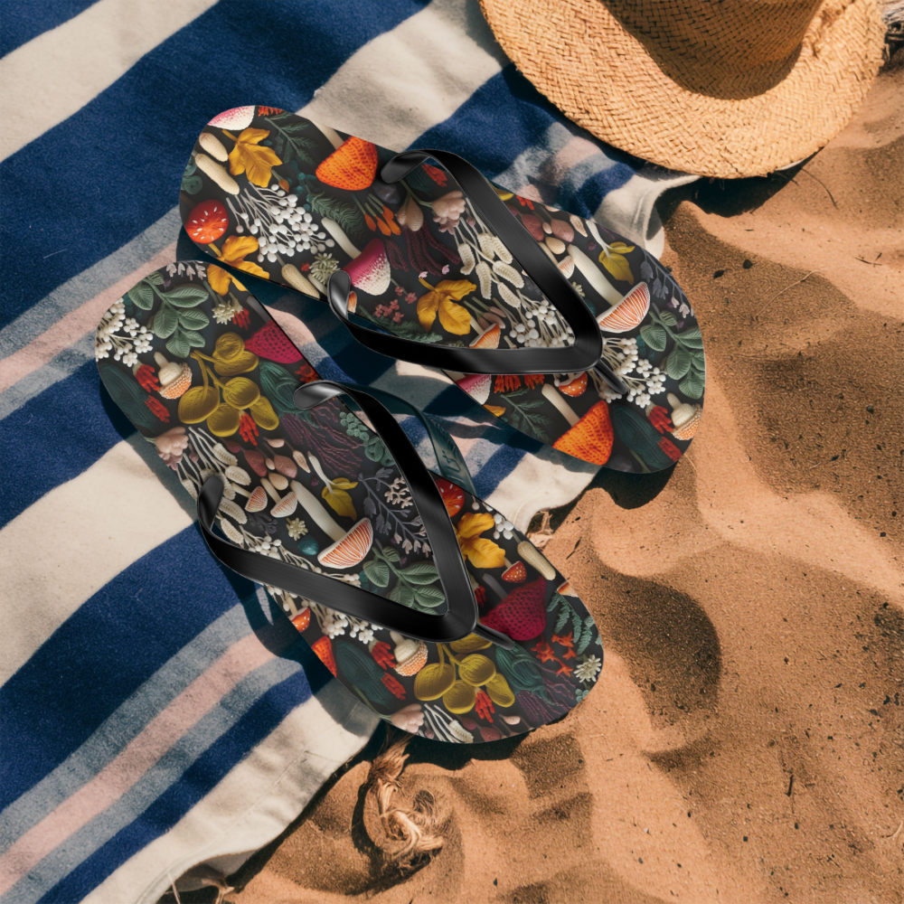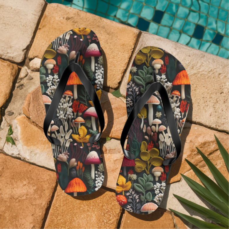 Flip flops have a polyester fabric top with a 1/2 inch black rubber sole, and a secure black strap.