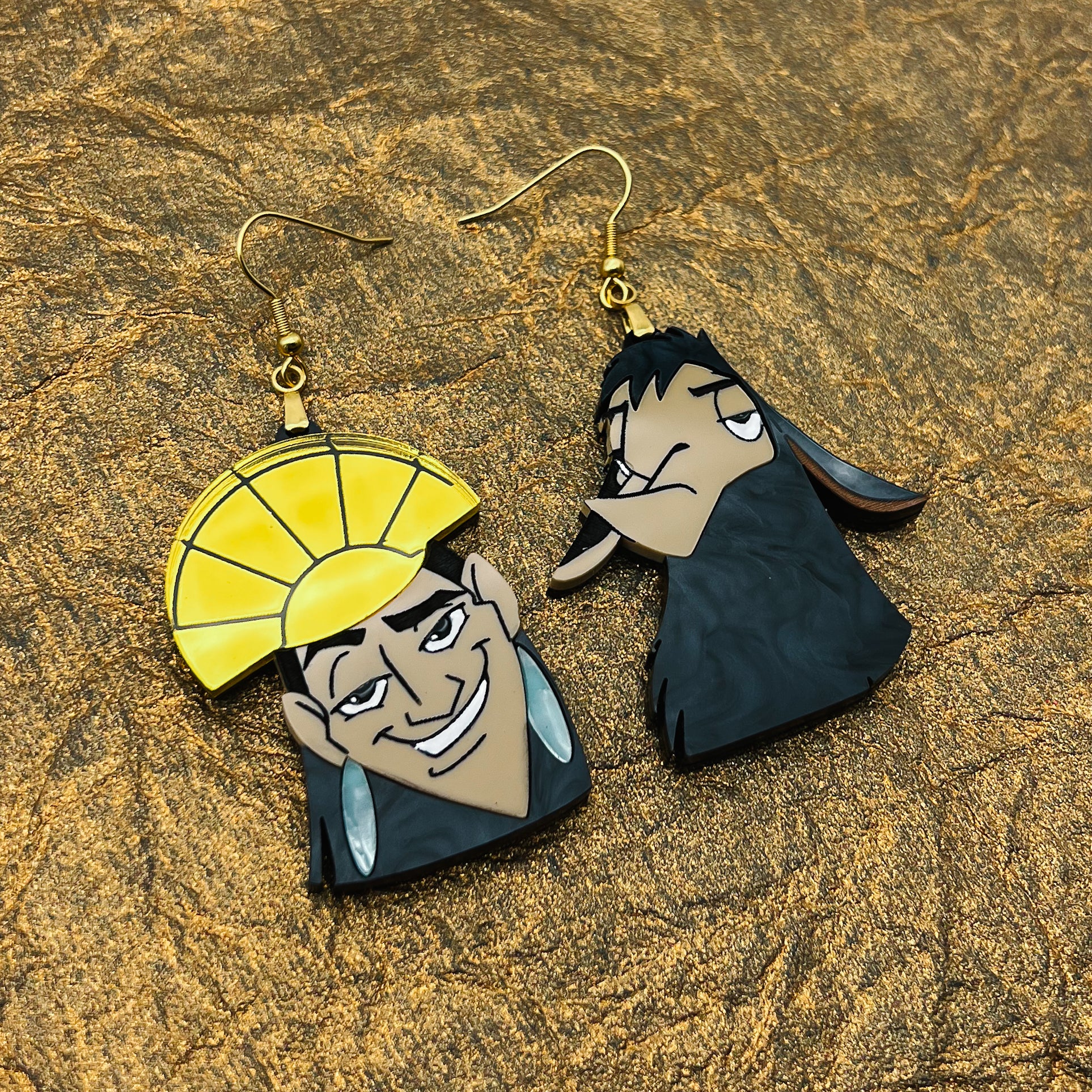 How incredible are these showstoppers?! Mismatched Kuzco dangles cut from a marble black, yellow mirror, and blue shell acrylic! Perfect for any Disney lover!