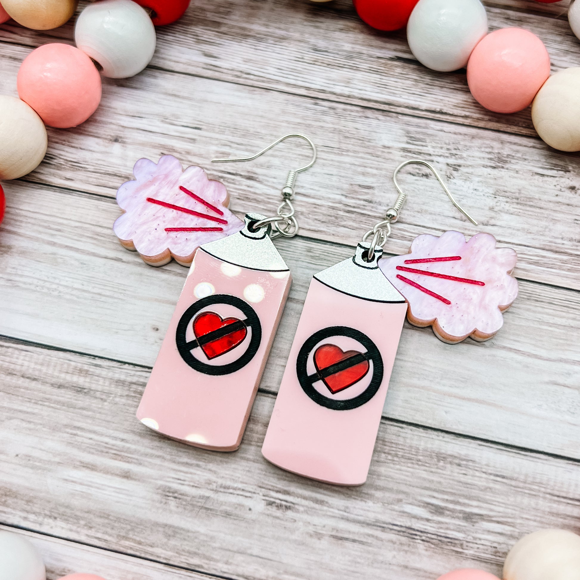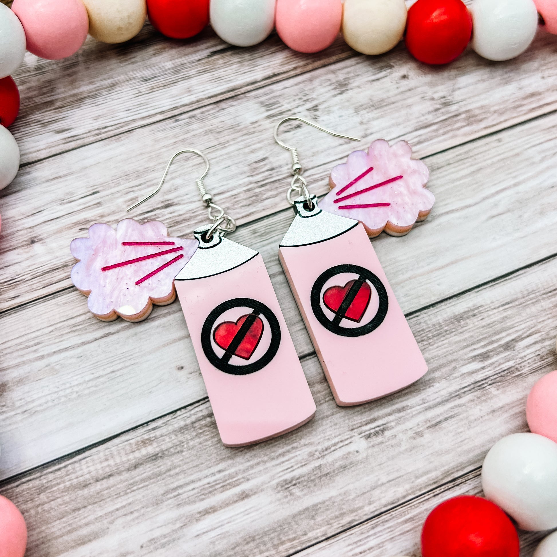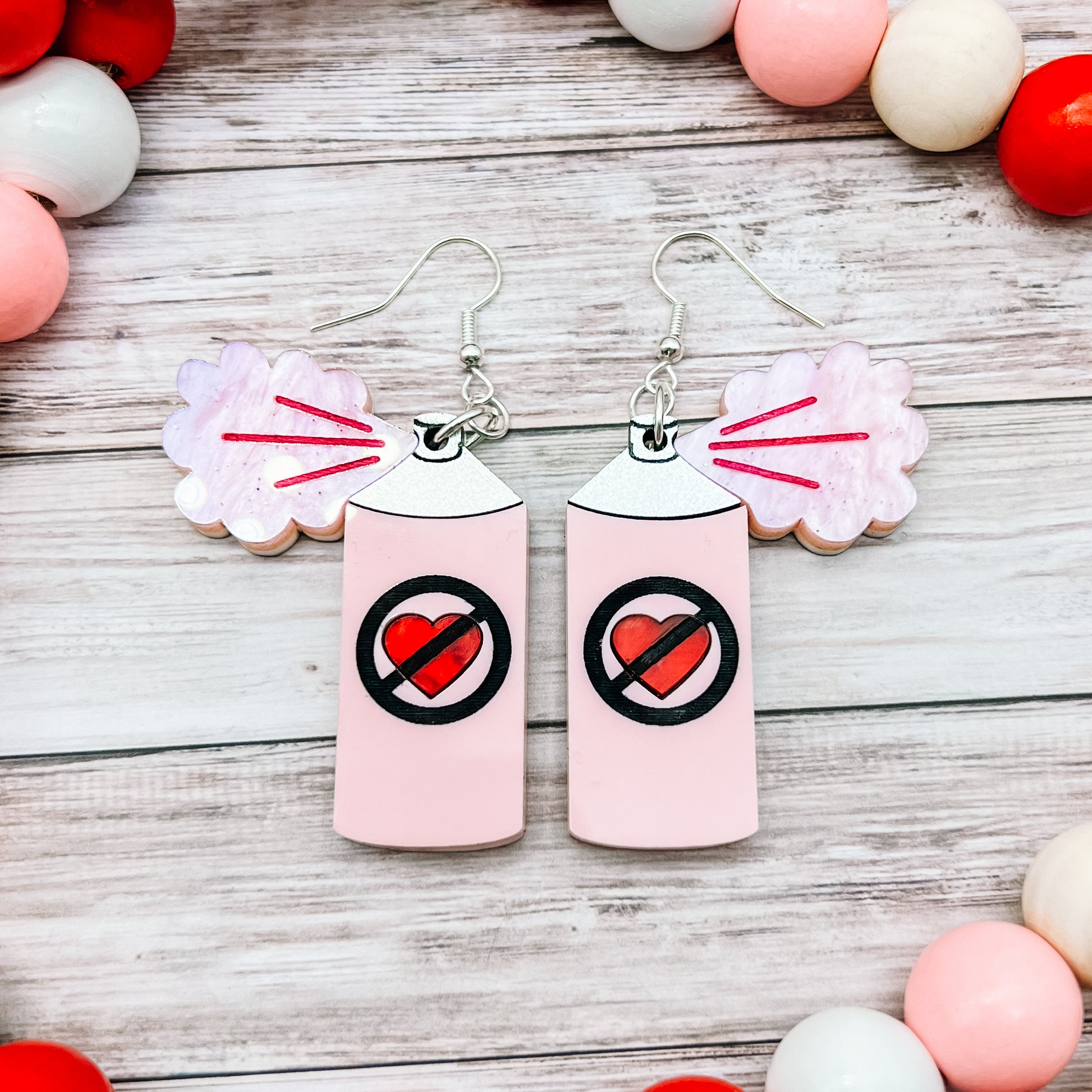 How incredible are these anti-valentines/anti-love earrings?! 🤩 Laser cut white and pink acrylic can shape with red marble heart cross offed with black acrylic.  Spray is off pink marbled acrylic and hand-painted red lines.