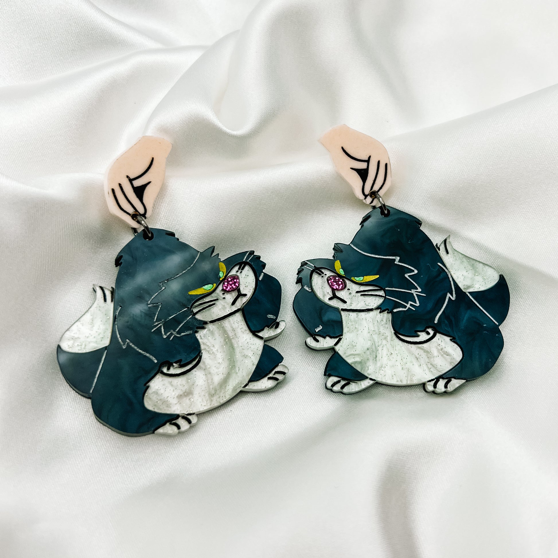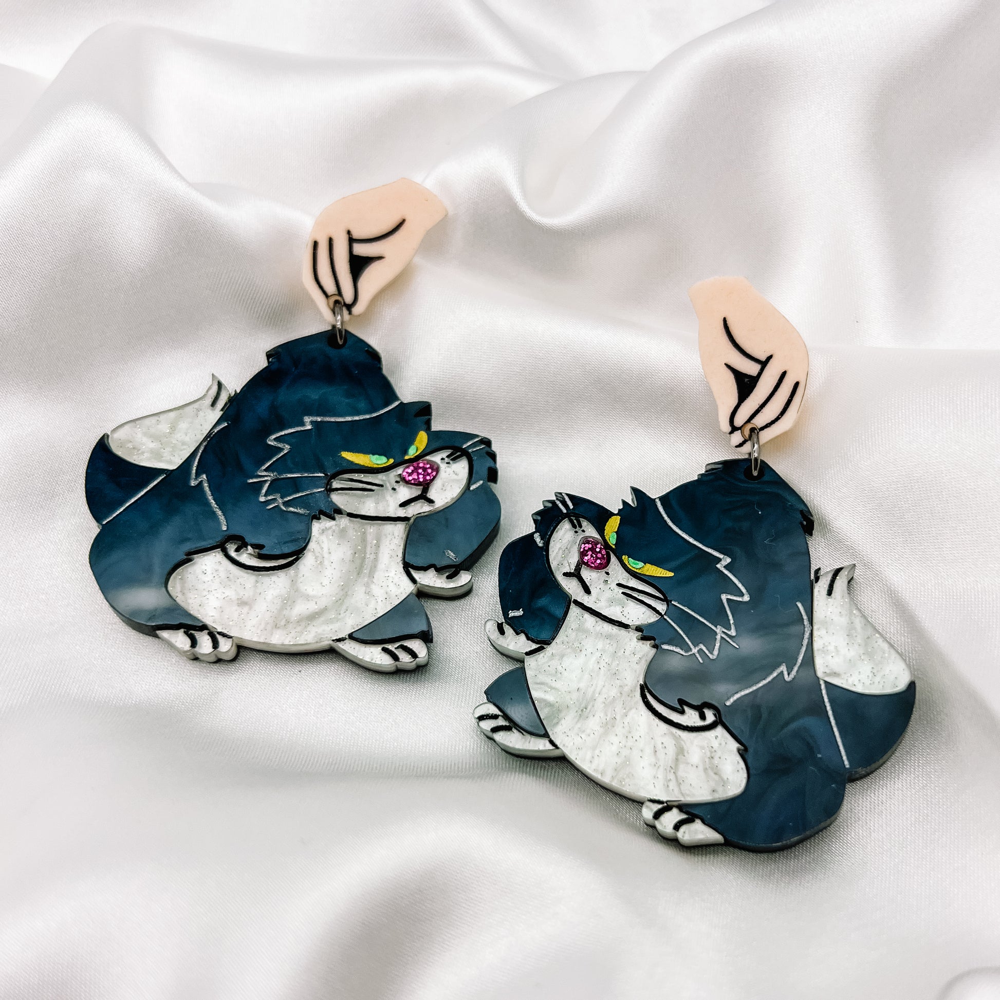 How incredible are these earrings of Lucifer from Cinderella?! Laser cut earrings made from black and ivory marble, with Cinderella’s hand grabbing him as the post! Perfect for any Disney lover!
