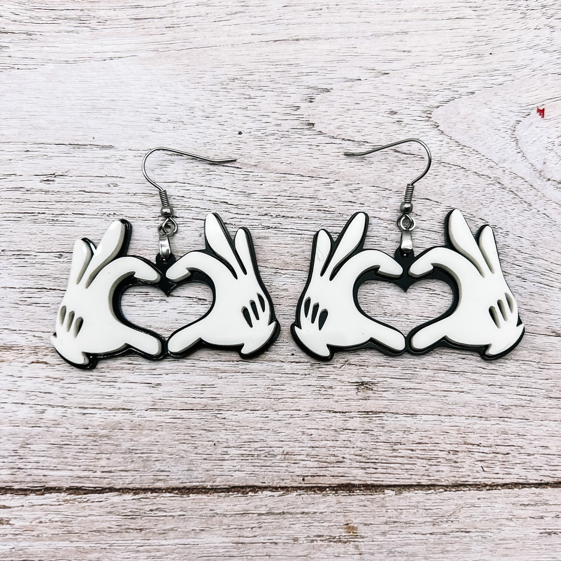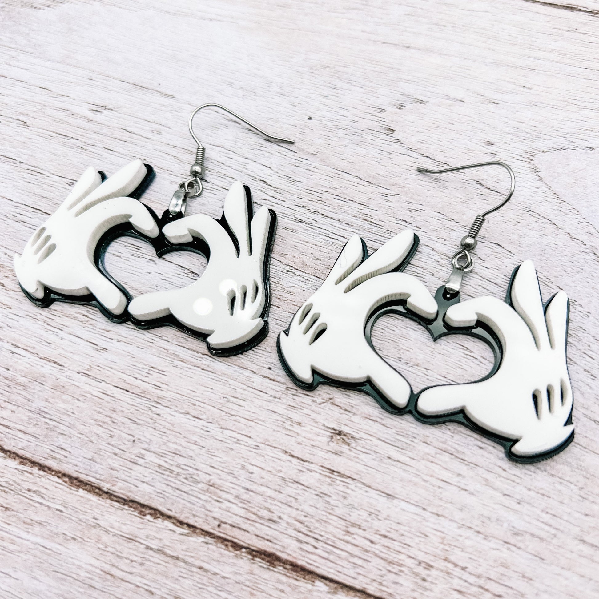 Laser cut Mickey heart hands made from glossy black and white acrylic. Adorable for any Disney fan!