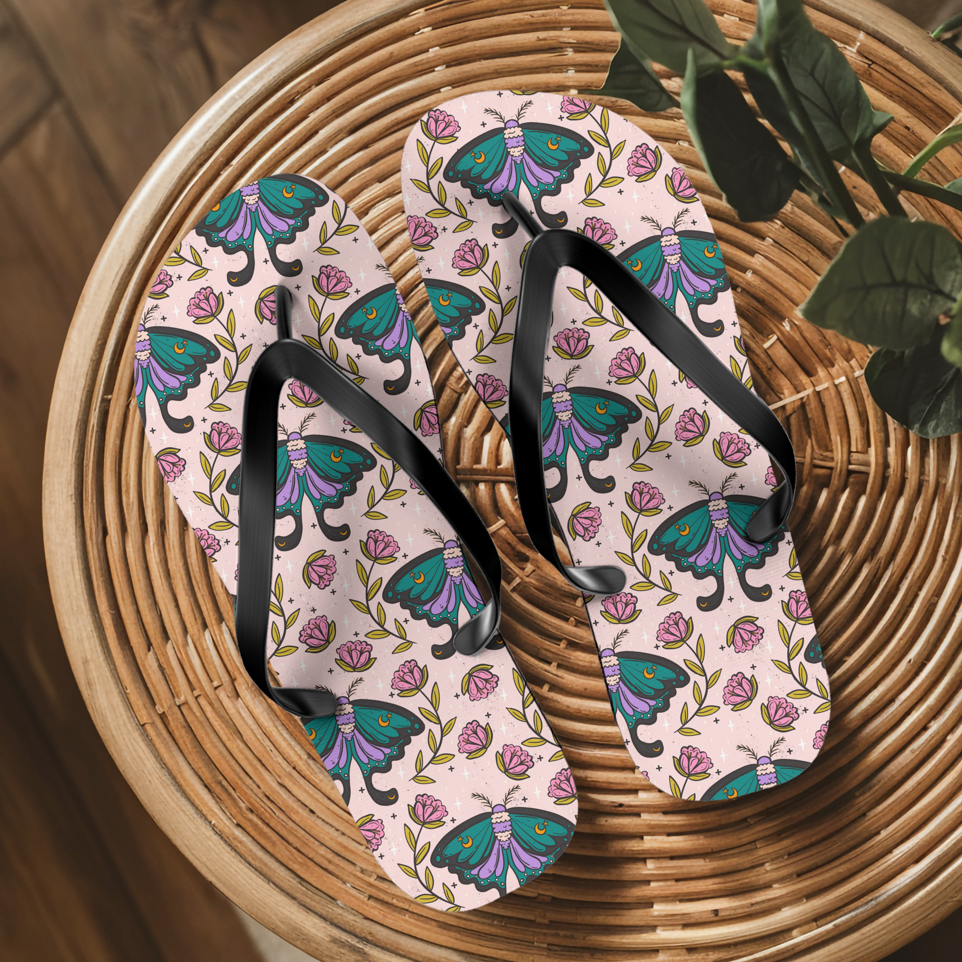 Flip flops have a polyester fabric top with a 1/2 inch black rubber sole, and a secure black strap.