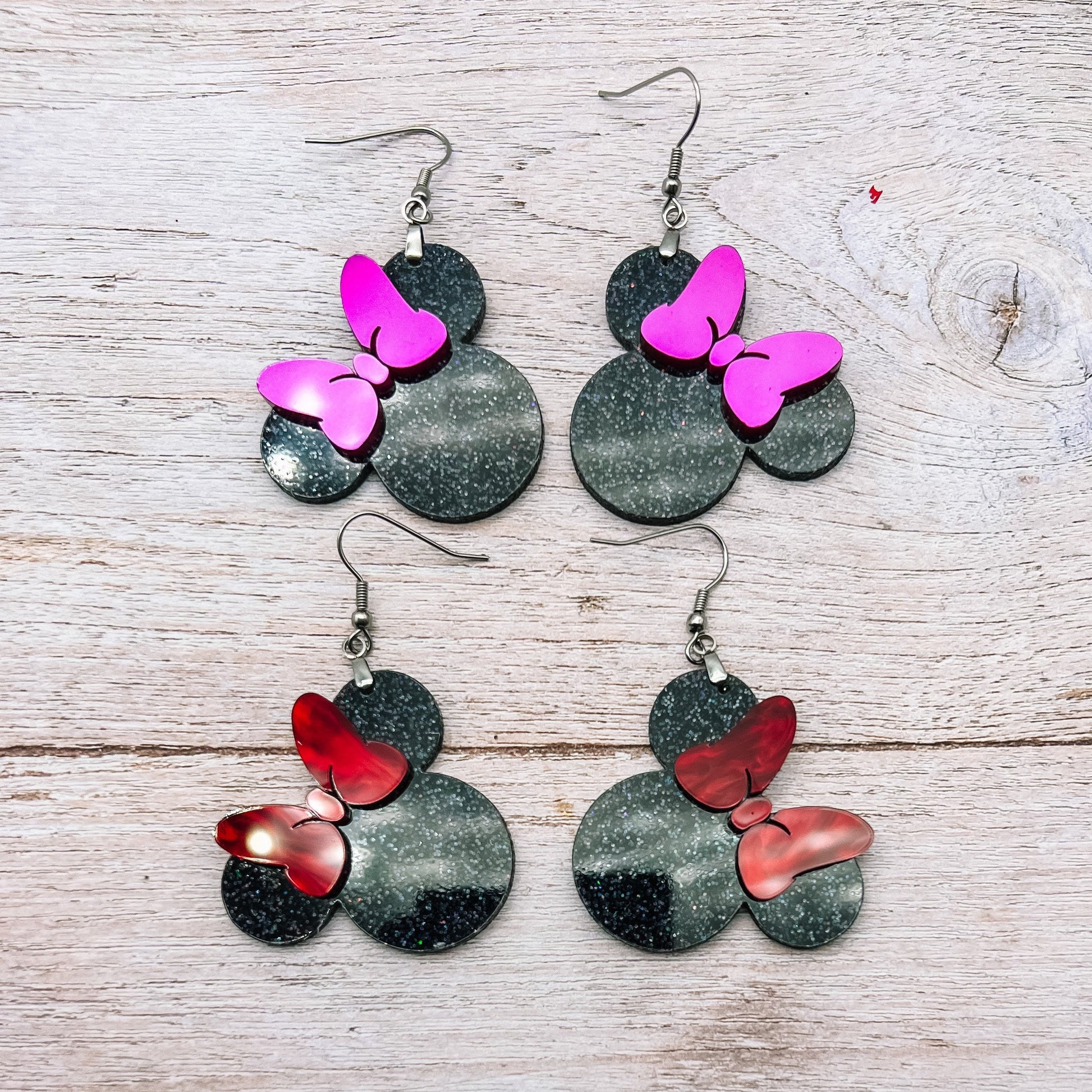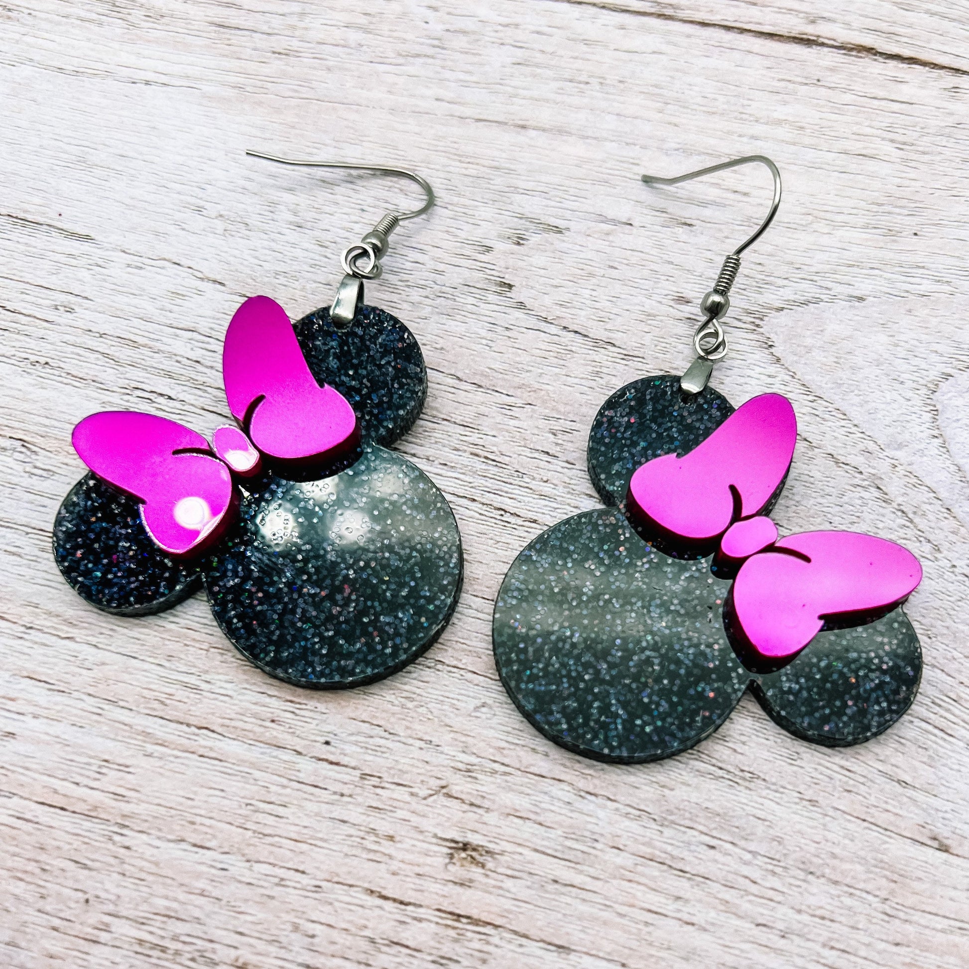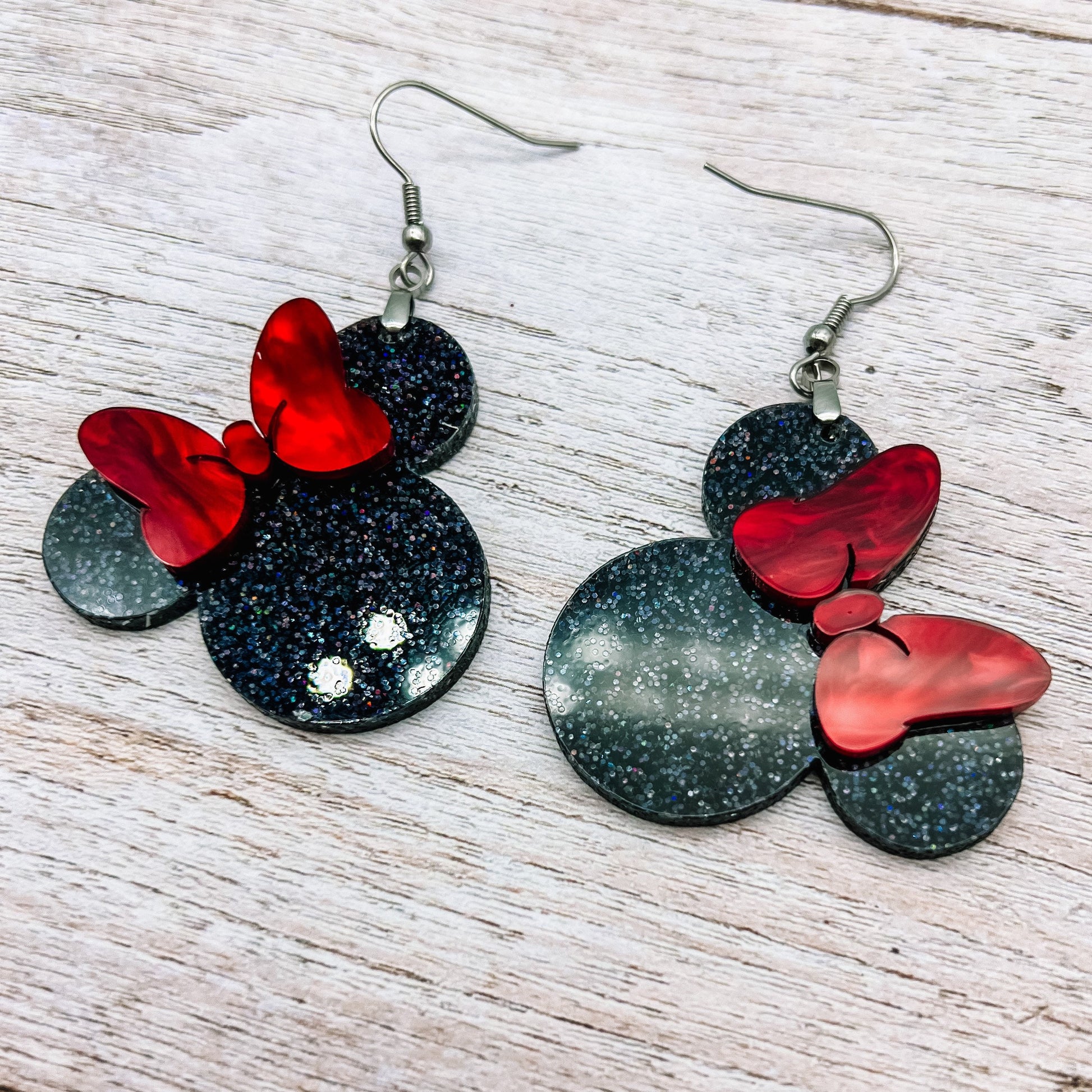 Your favorite girly mouse cut from black glitter acrylic with your choice of metallic pink or red marble for the bow! Perfect for any Disney fan!These lightweight earrings measured 1.6 inches inches long, not counting the hypoallergenic hooks .