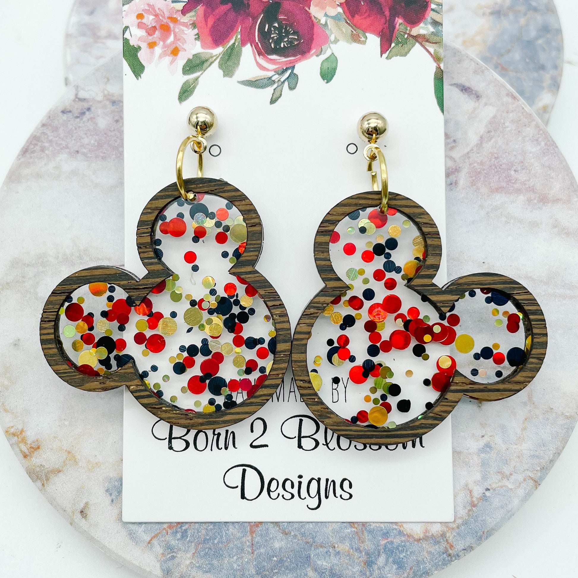Laser cut Mouse heads. These earrings are made from a clear acrylic filled with red, black, and gold circle glitter. I framed the earrings in a wood veneer! The acrylic is transparent so they take on whatever color is behind them! These beauties are so adorable and perfect for all you Disney lovers!