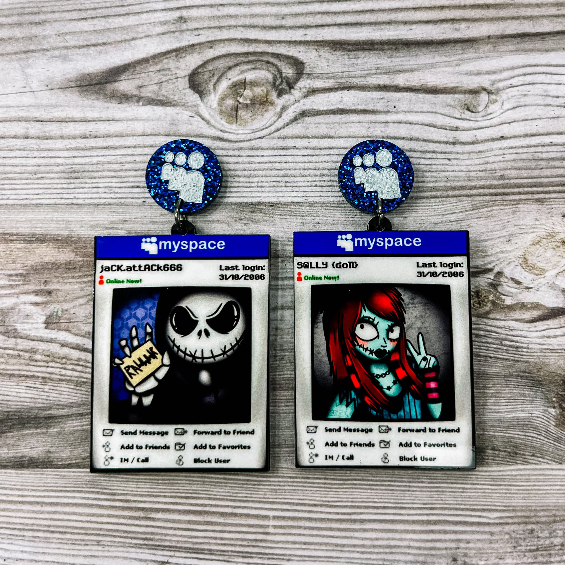 Jack & Sally MySpace profile dangles! Sublimated on single sided unisub and paired with a blue glitter circle post! Perfect for any elder Emo!