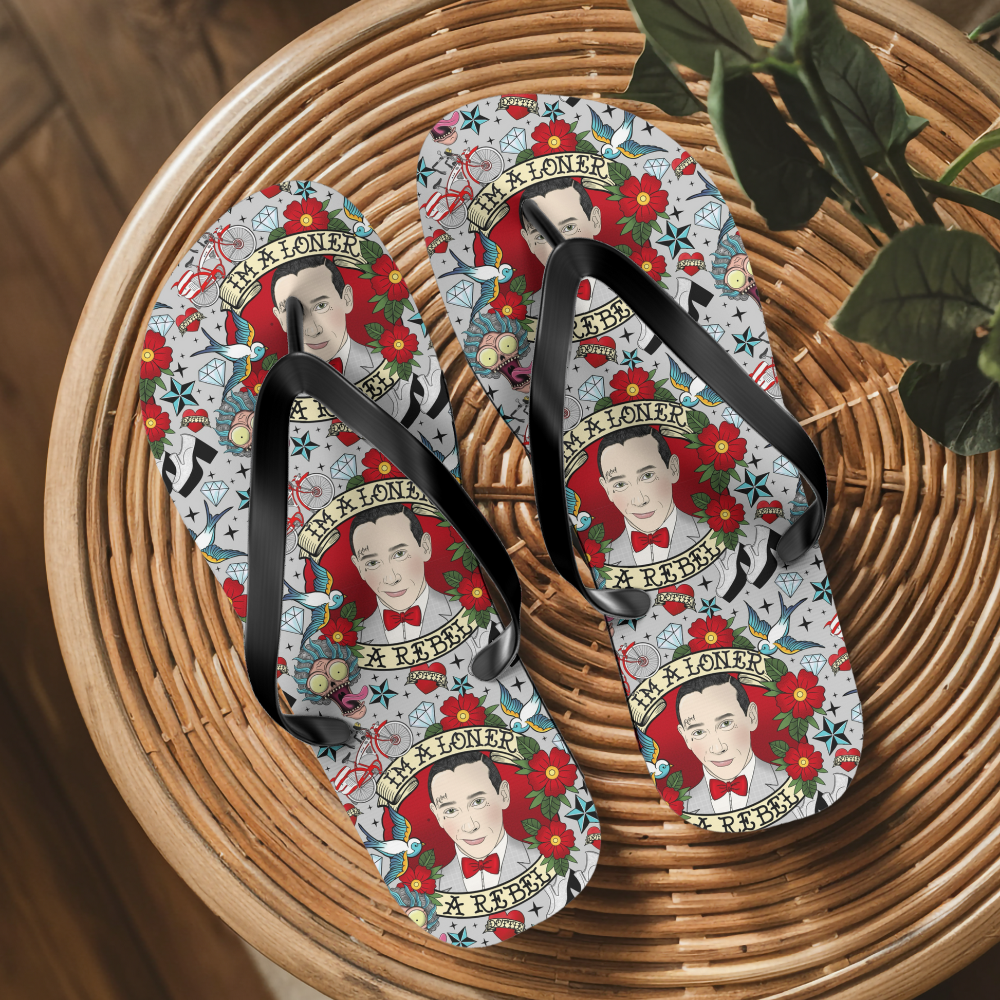 Flip flops have a polyester fabric top with a 1/2 inch black rubber sole, and a secure black strap.