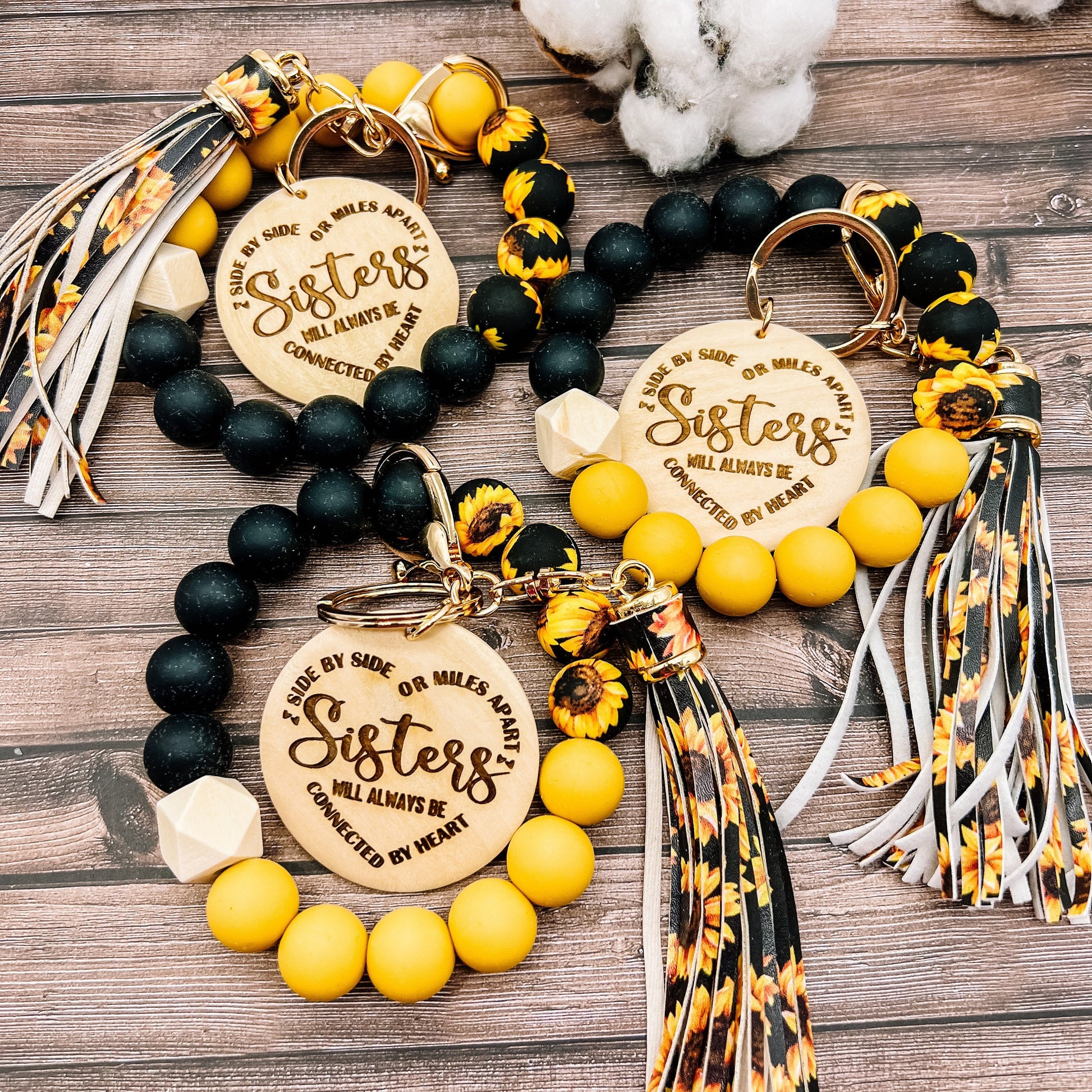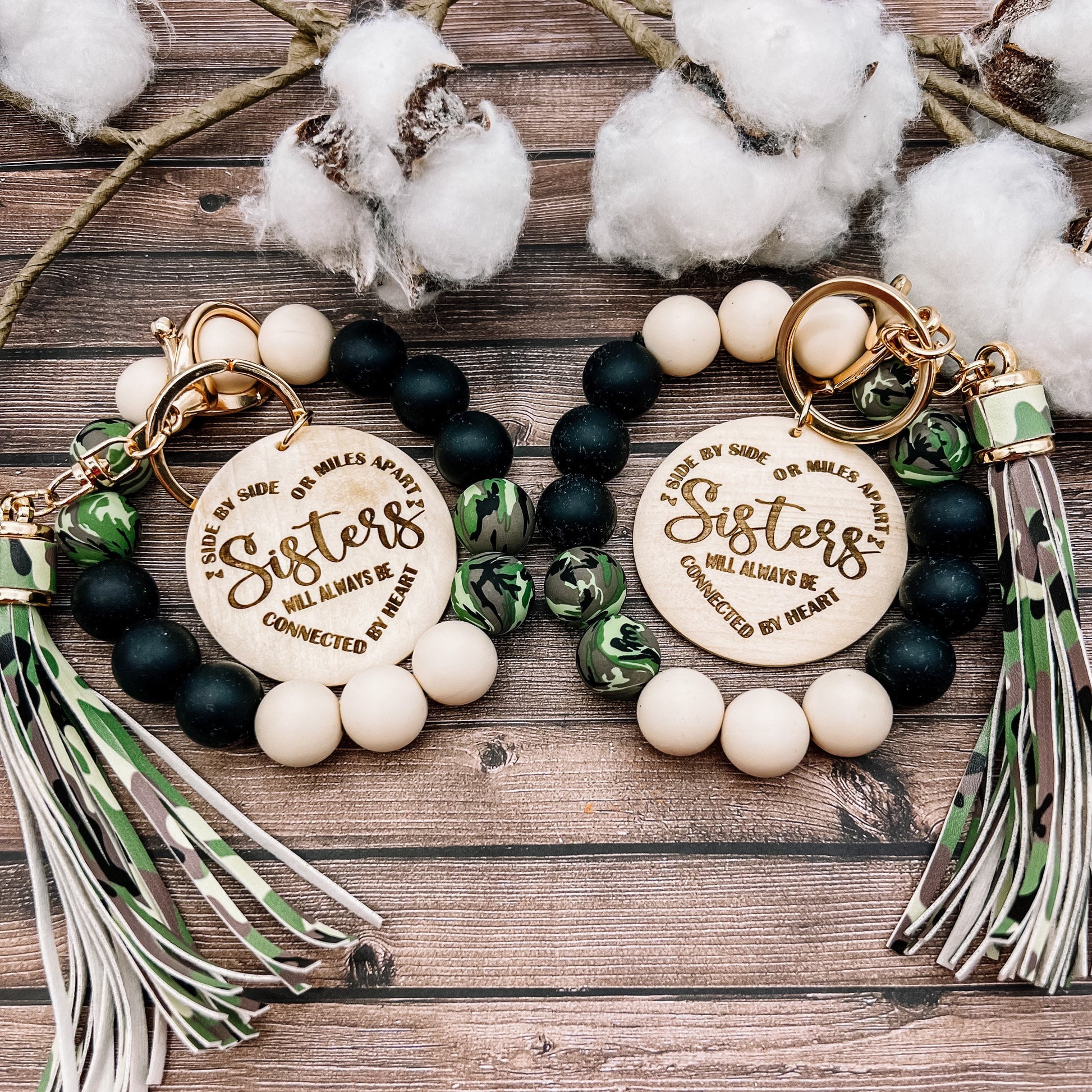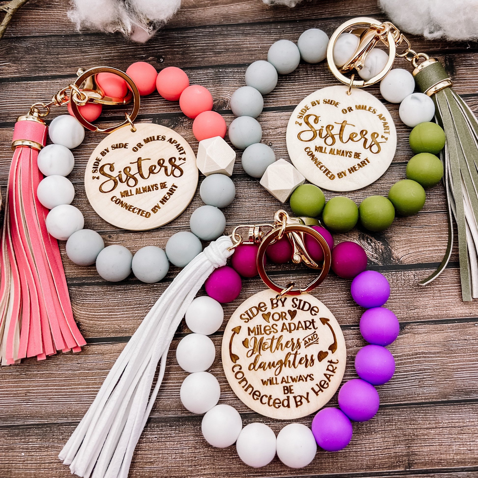 This listing is for 1+ keychain bracelet, made with your color choice of silicone beads. It includes a matching tassel and a wood disc with the sisters quote engraved on it. You can also have a name engraved on the back. If you would like a different saying, send me a message!