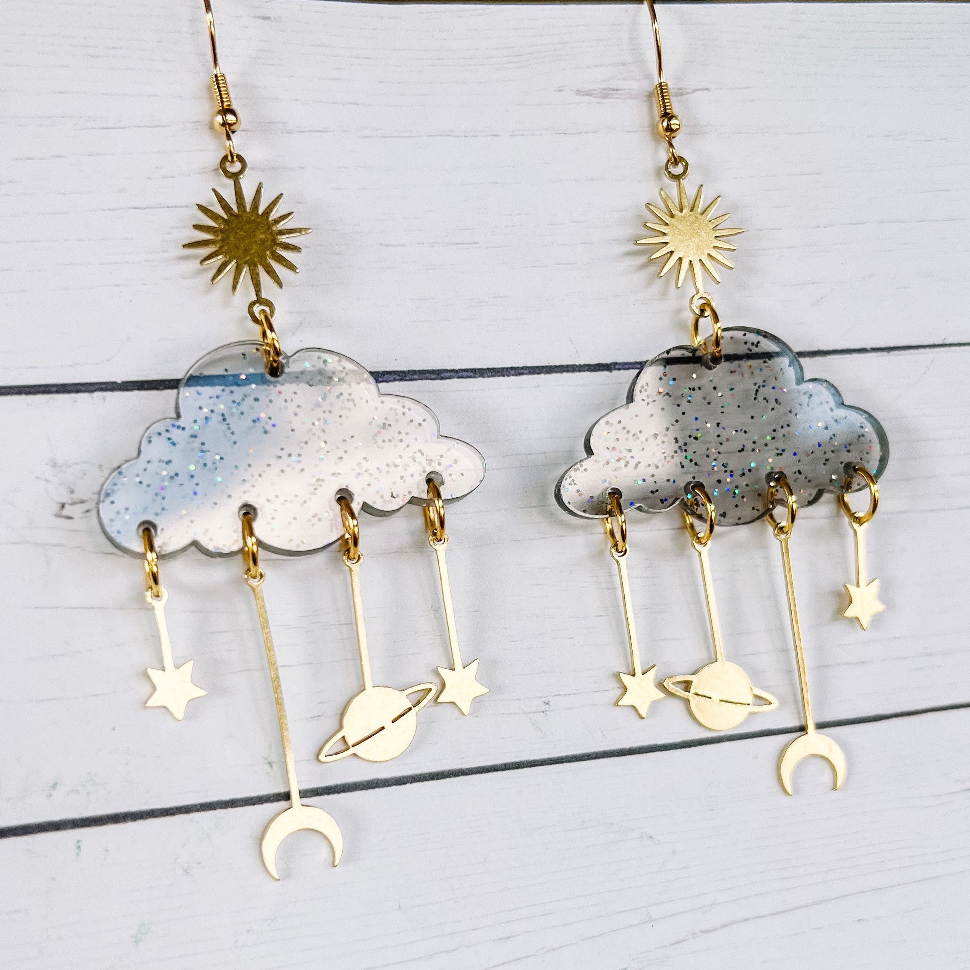 How incredible are these showstoppers?! 🤩 Laser cut clouds made from a Smokey transparent acrylic with flecks of rainbow acrylic! Adorned with various brass charms (charms may vary in length from what you see in listing picture). Truly incredible!