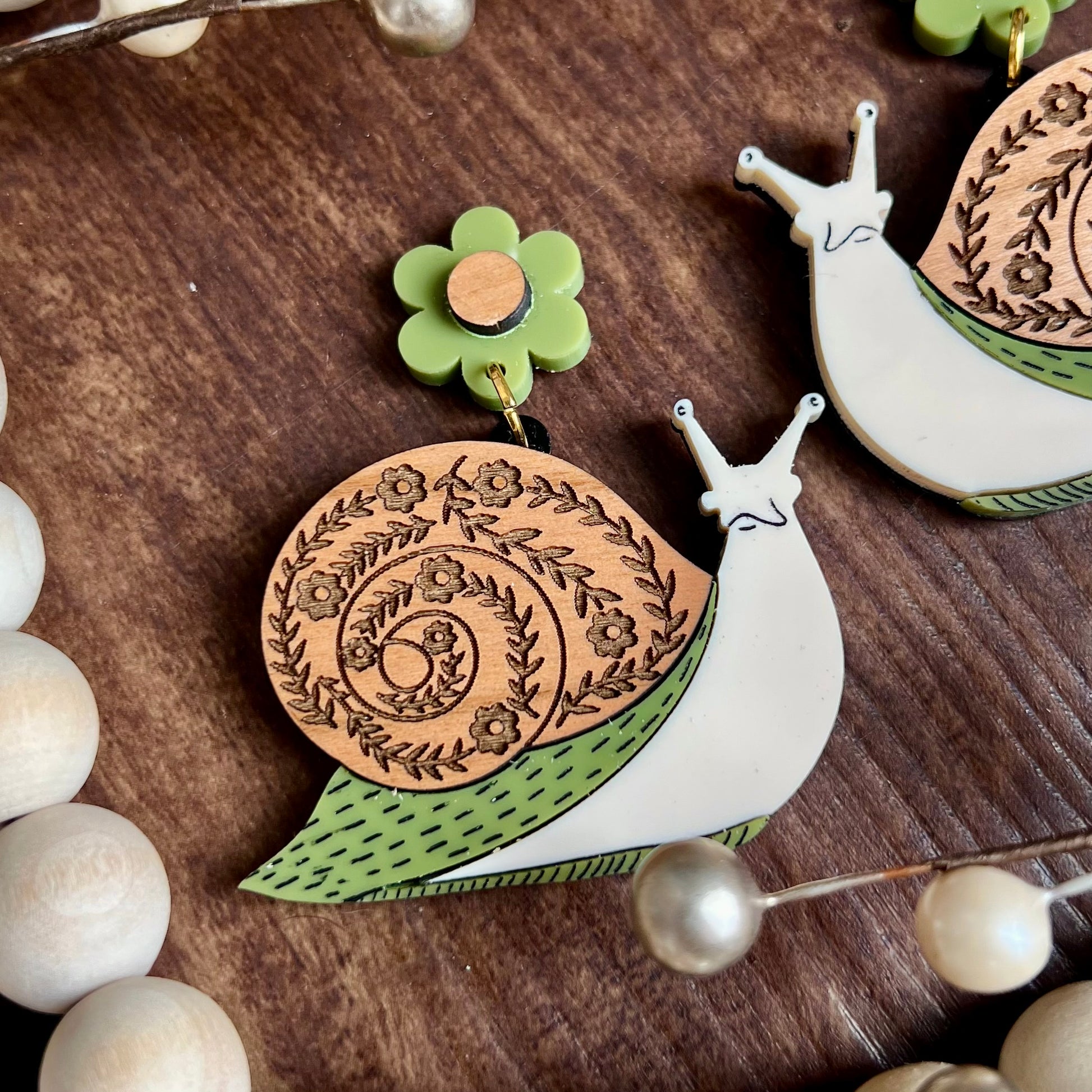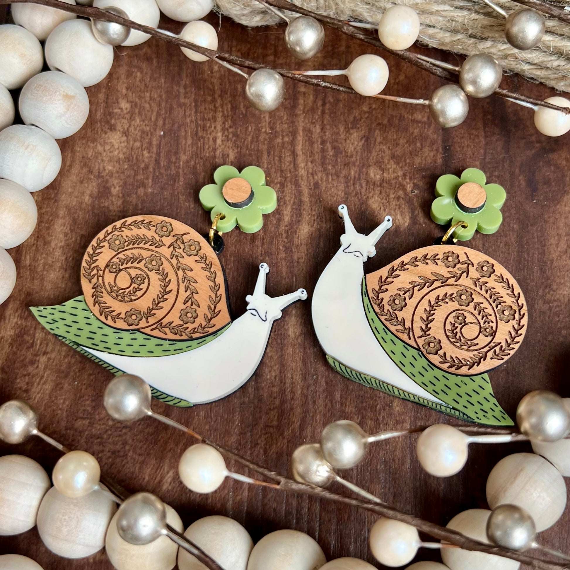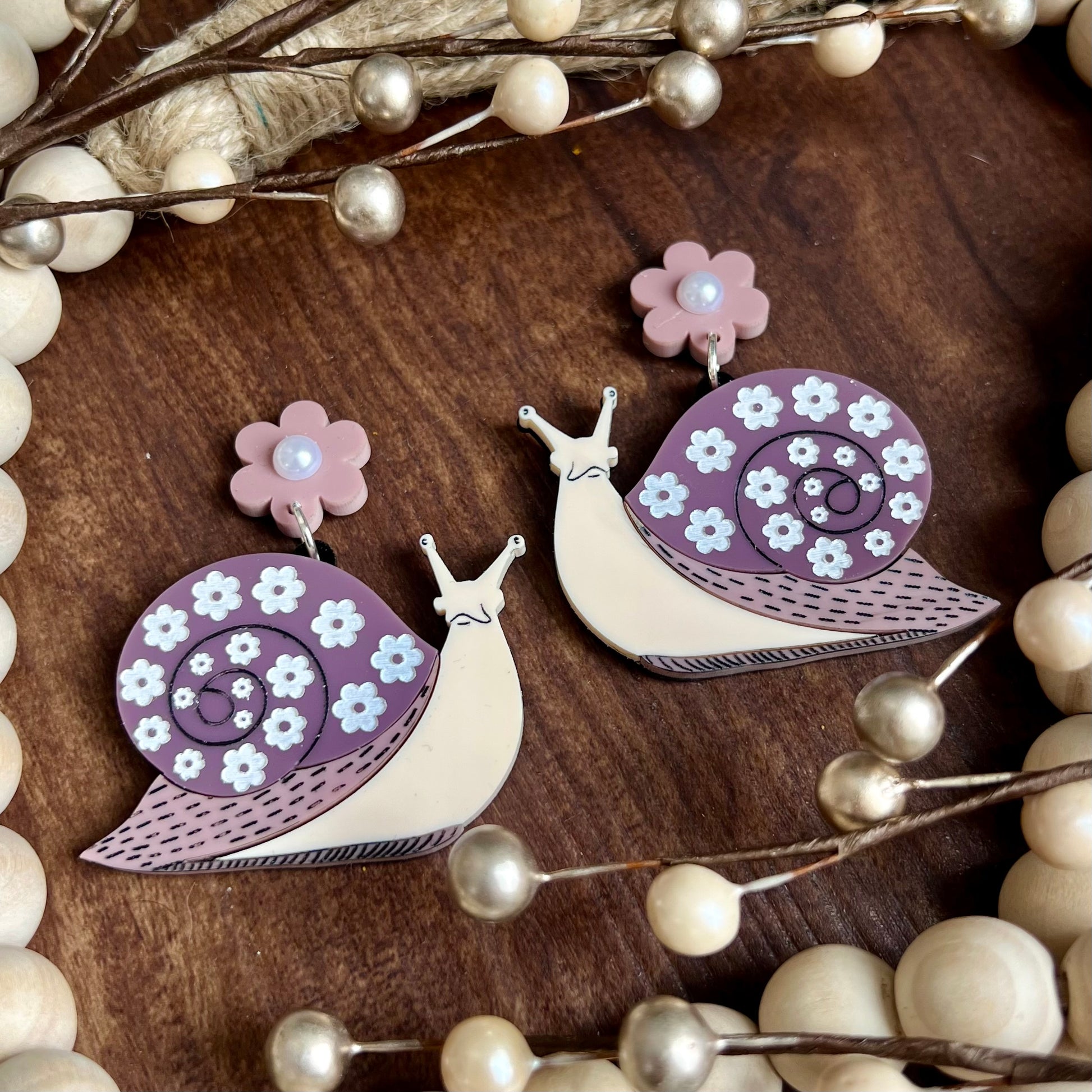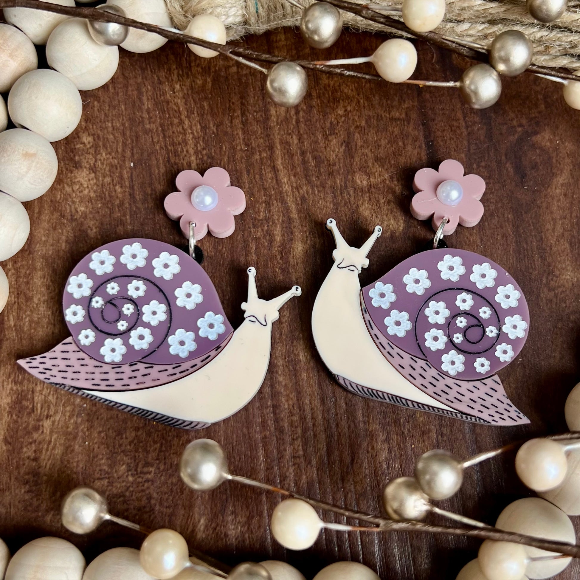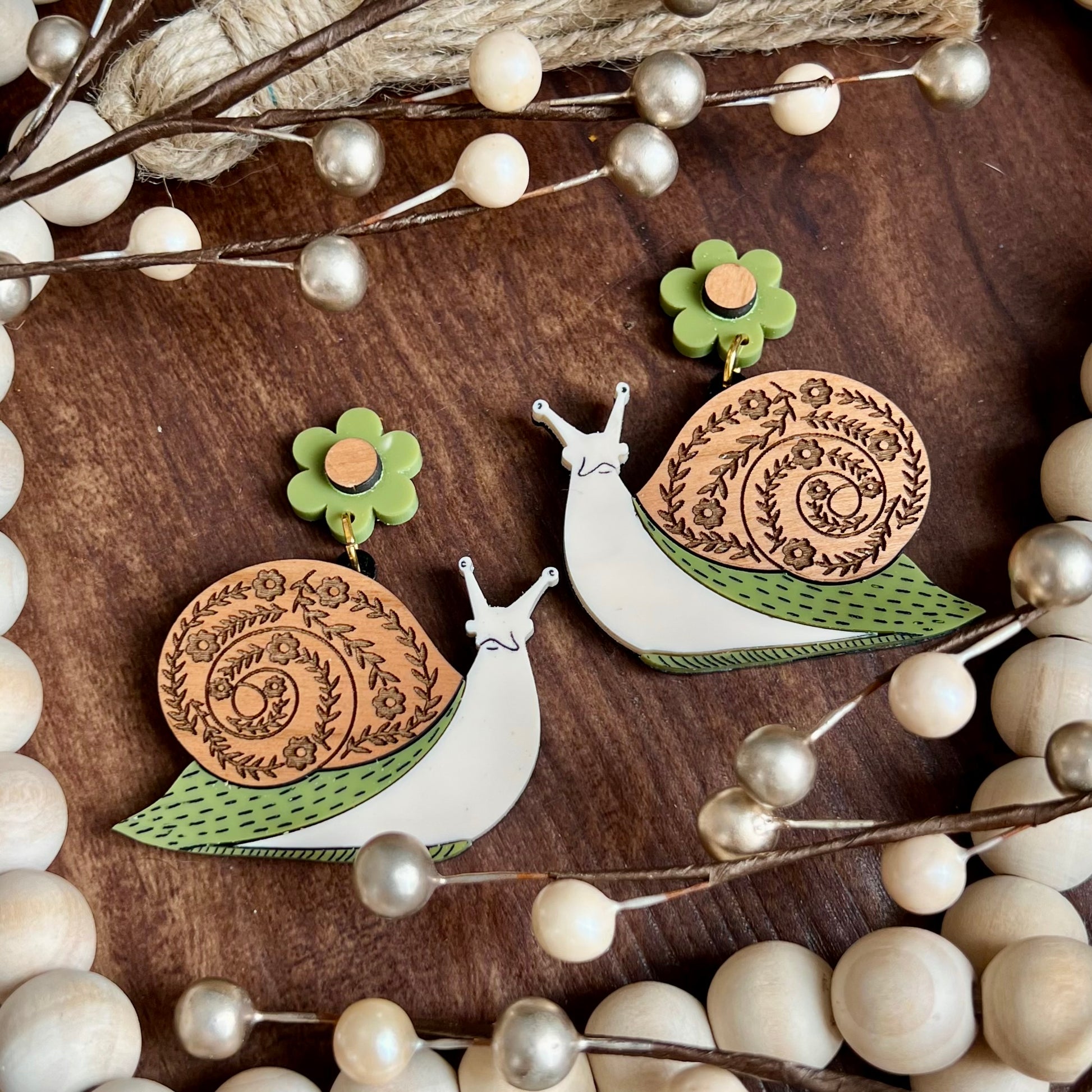 The cutest snails in 2 color options - cherry wood with olive green, or pastel purple! Major boho/retro vibes with these! Perfect all spring and summer long!