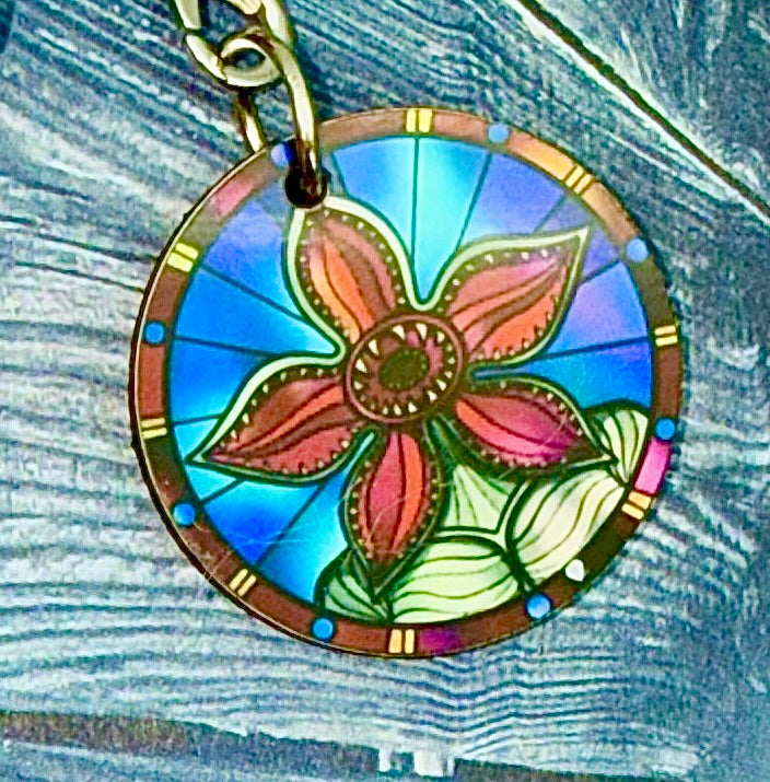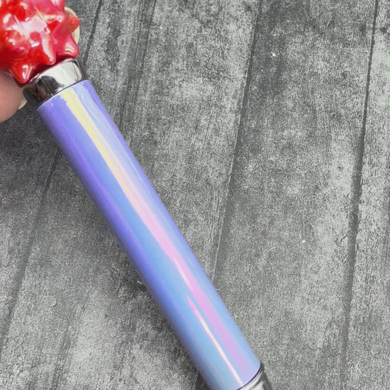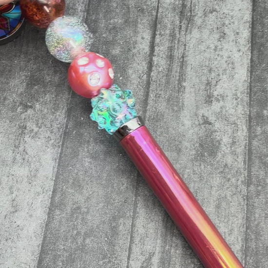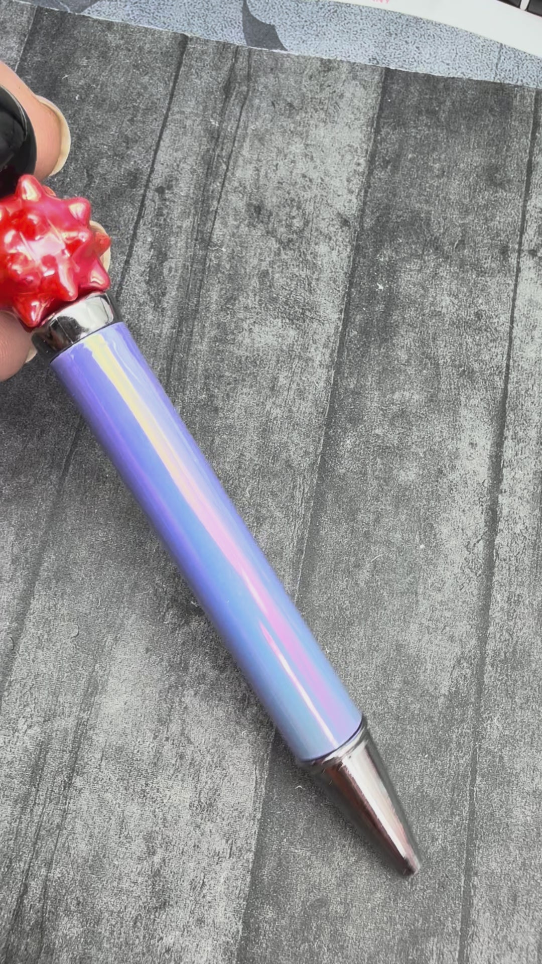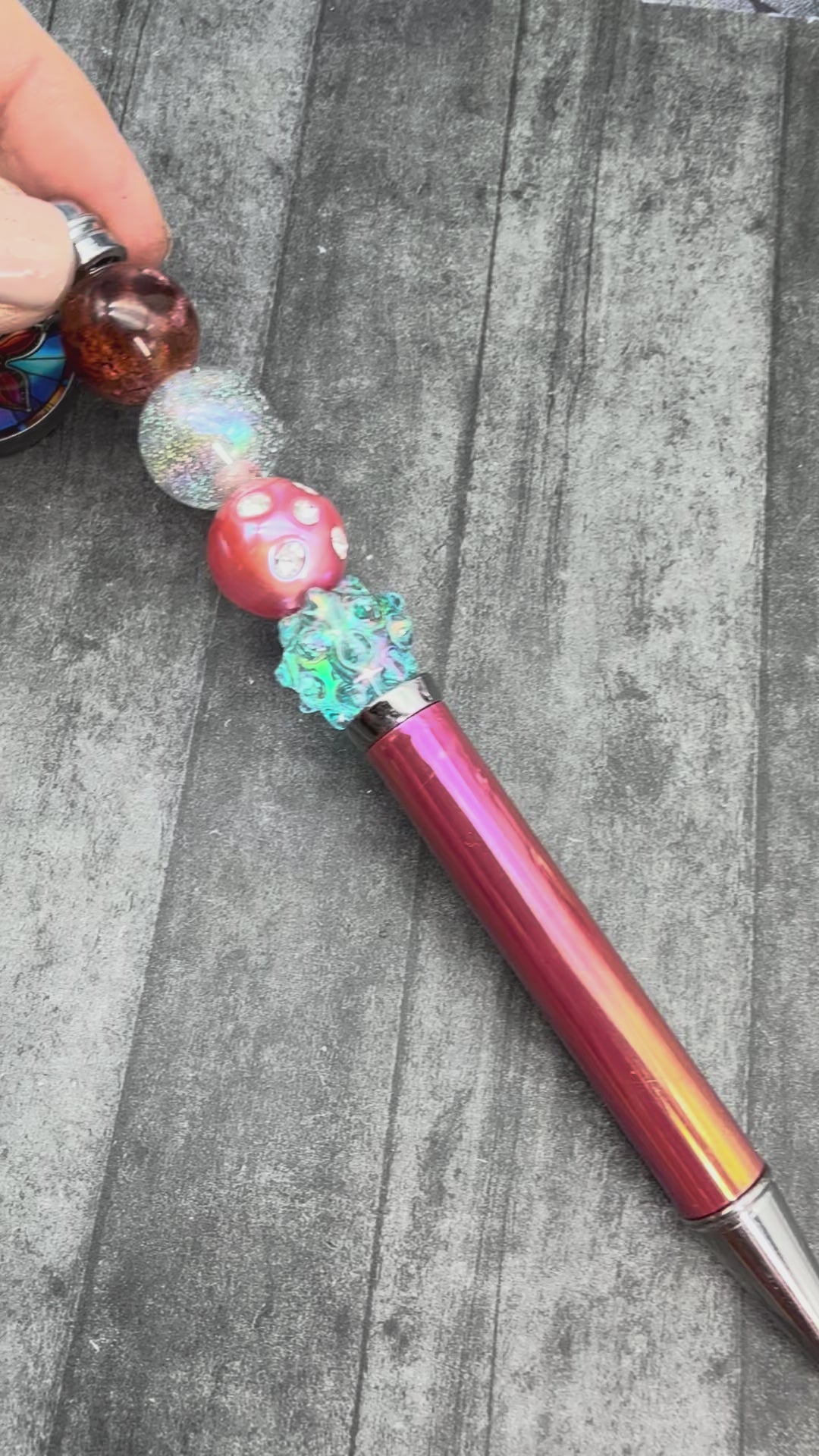 Pen #1: The gradient colored red/orange/gold UV Electroplated metal pen adds life to the Demogorgon flower-like mouth acrylic charm. Enhanced with beads of various shapes and materials in light blues and reds.