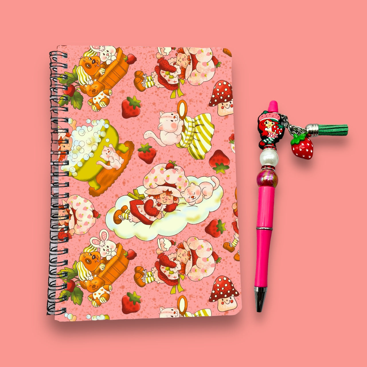 Iconic imagery from 80s cartoon, Strawberry Shortcakd, on a notebook with coordinating pen!
