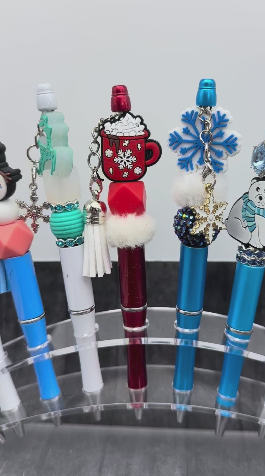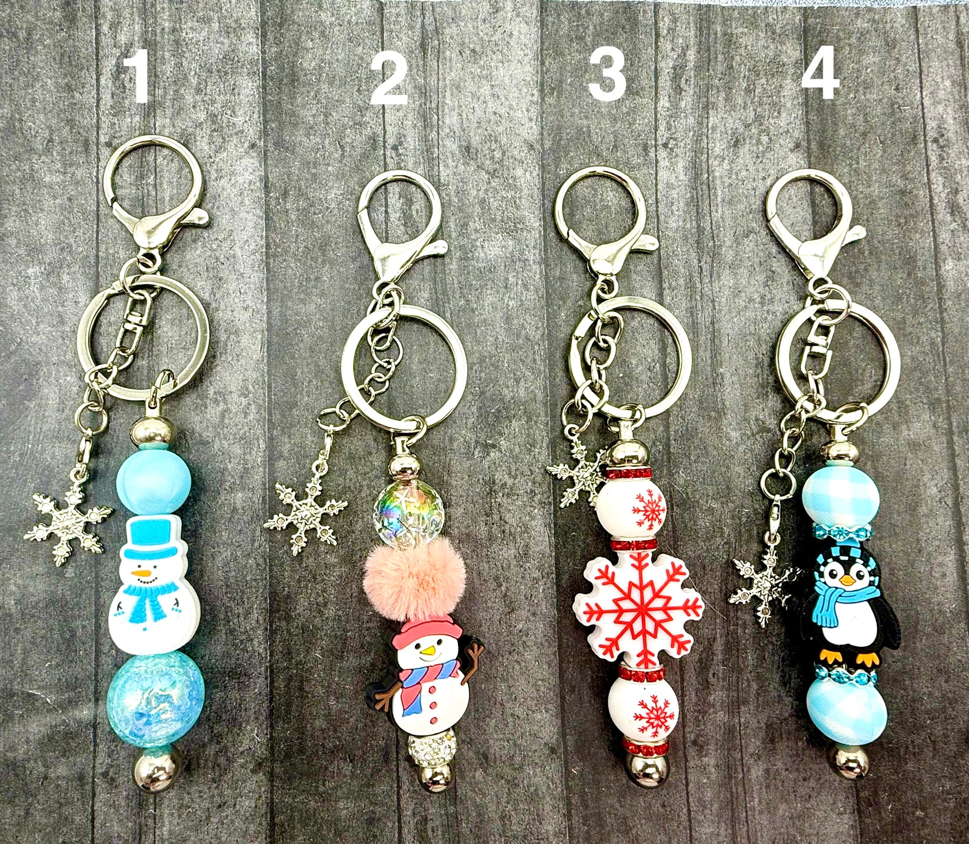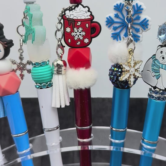 Winter themed pens and keychains featuring silicone focal beads such as snowflakes, snowmen, sweaters, hats, and even polar bears.  Pens are accented with tassels or Charms like stars, snowflakes, snowmen, or angels.